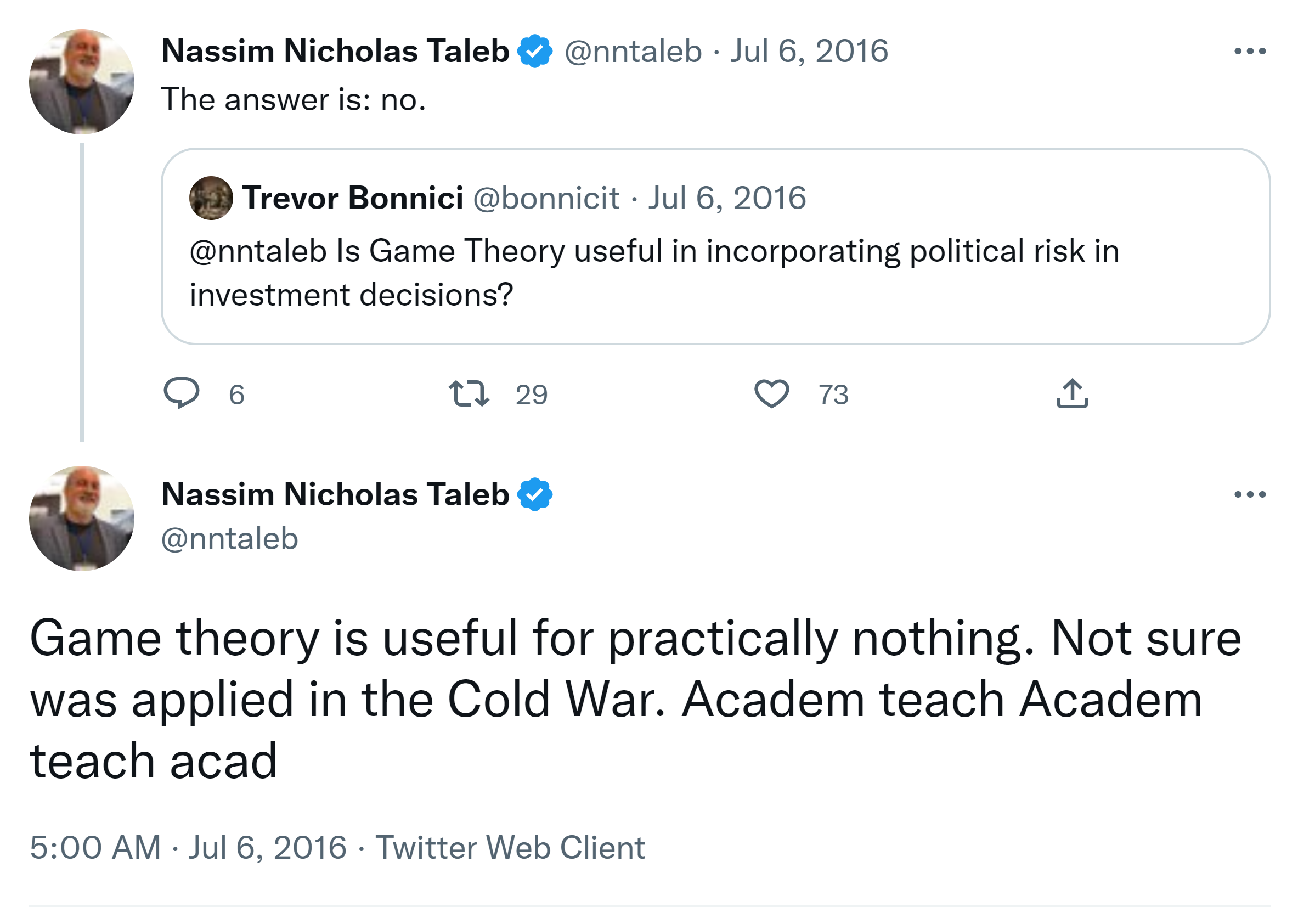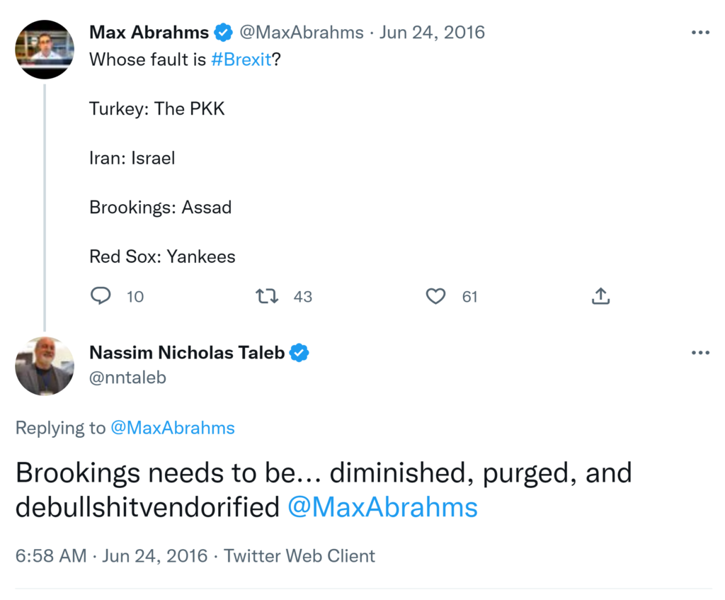 SOME BS DETECTION – I feel compelled to debunk a deceitful “experiment” (actually a total scam) because many many of my friends fell for it. The experiment illustrates the ludic fallacy (that is, a reduction of real life to an oversimplified, domain-dependent experiment giving results often opposite to reality). -We are shown identical twins, one chewing gum, the other completely idle (or trying to be so). We are told that the majority of people impart positive qualities to the one who is chewing gum … and that the experiment was done with a “large n” of twins. But these results come from the fact that one of the twins is animated while the other one is frozen; it has nothing to do with gum –plus the fact that someone standing still in front of a camera looks devoid of human qualities. -Note that the chewing gum industry is financing the “experiment”. -To make the experiment “real” or “ecological”, you need to film the twins in real life doing real things, only one of the two chewing gum. – GENERALIZING: In a nutshell, although this is not a real experiment, it shows in a carricatual way why many academic papers in social science are BS in spite of looking like a “controlled experiment”. PS- Most research on biases in the evaluation of small probabilities fall into the same class of errors.