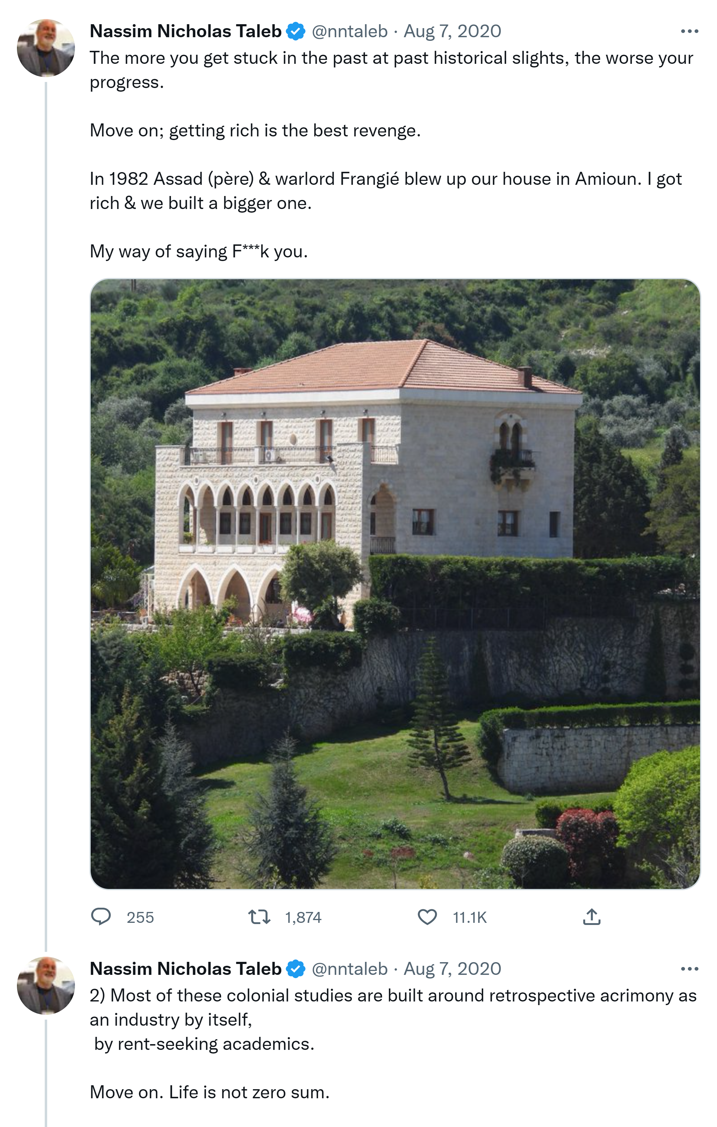 The more you get stuck in the past at past historical slights, the worse your progress. Move on; getting rich is the best revenge. In 1982 Assad (père) & warlord Frangié blew up our house in Amioun. I got rich & we built a bigger one. My way of saying F***k you. 2) Most of these colonial studies are built around retrospective acrimony as an industry by itself, by rent-seeking academics. Move on. Life is not zero sum.