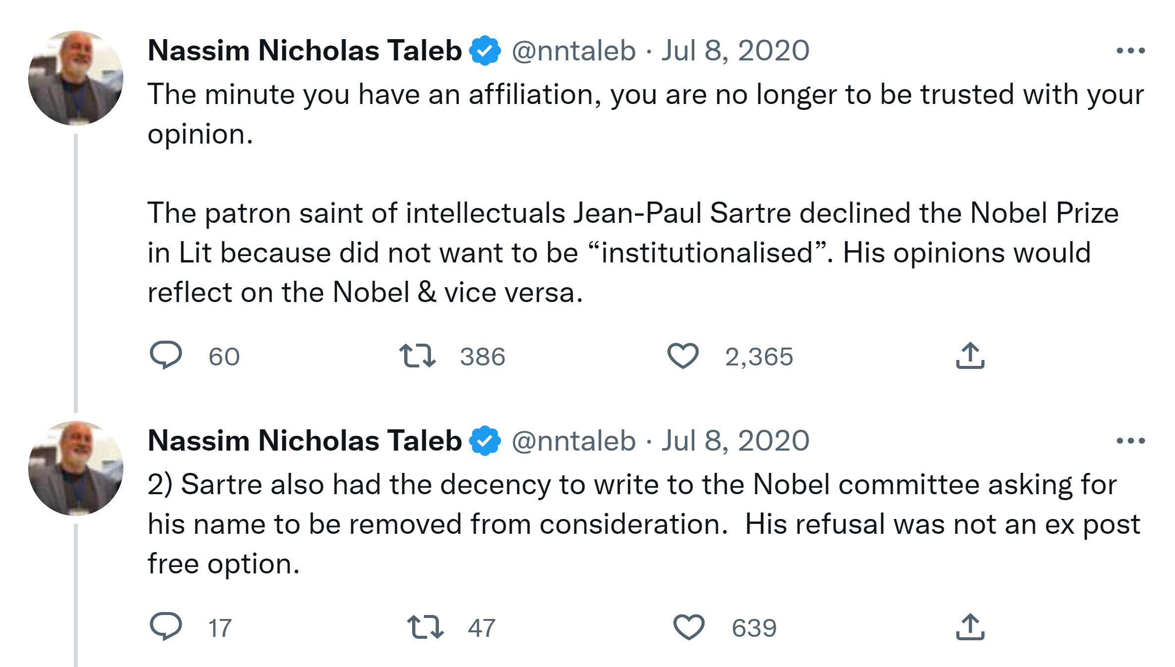 The minute you have an affiliation, you are no longer to be trusted with your opinion. The patron saint of intellectuals Jean-Paul Sartre declined the Nobel Prize in Lit because did not want to be “institutionalised”. His opinions would reflect on the Nobel & vice versa. 2) Sartre also had the decency to write to the Nobel committee asking for his name to be removed from consideration. His refusal was not an ex post free option.