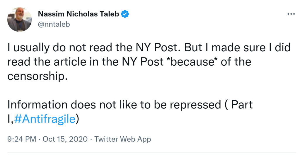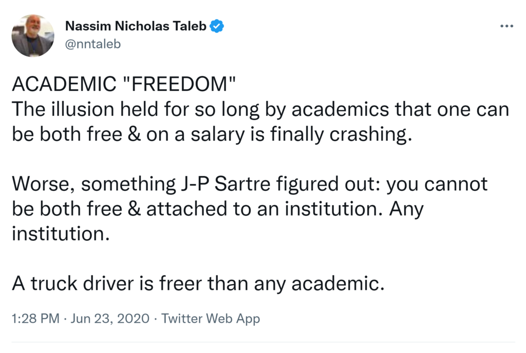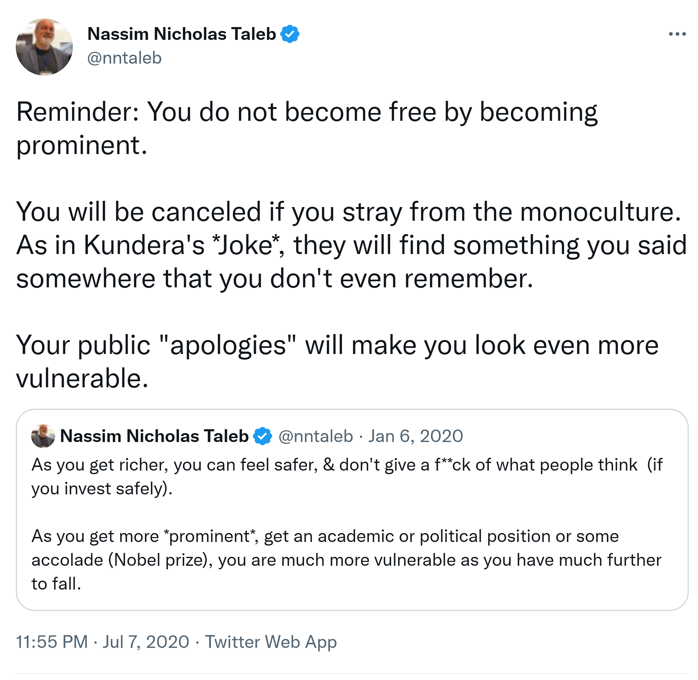 Reminder: You do not become free by becoming prominent. You will be canceled if you stray from the monoculture. As in Kundera’s *Joke*, they will find something you said somewhere that you don’t even remember. Your public “apologies” will make you look even more vulnerable. As you get richer, you can feel safer, & don’t give a f**ck of what people think (if you invest safely). As you get more *prominent*, get an academic or political position or some accolade (Nobel prize), you are much more vulnerable as you have much further to fall.
