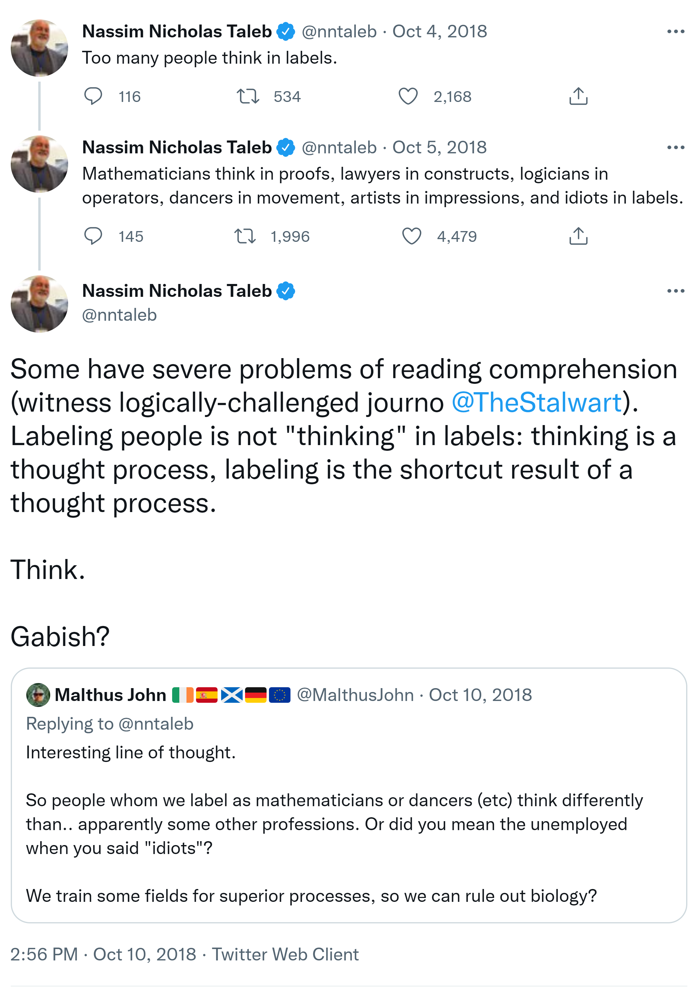 Too many people think in labels. Mathematicians think in proofs, lawyers in constructs, logicians in operators, dancers in movement, artists in impressions, and idiots in labels. Some have severe problems of reading comprehension (witness logically-challenged journo @TheStalwart ). Labeling people is not “thinking” in labels: thinking is a thought process, labeling is the shortcut result of a thought process. Think. Gabish?