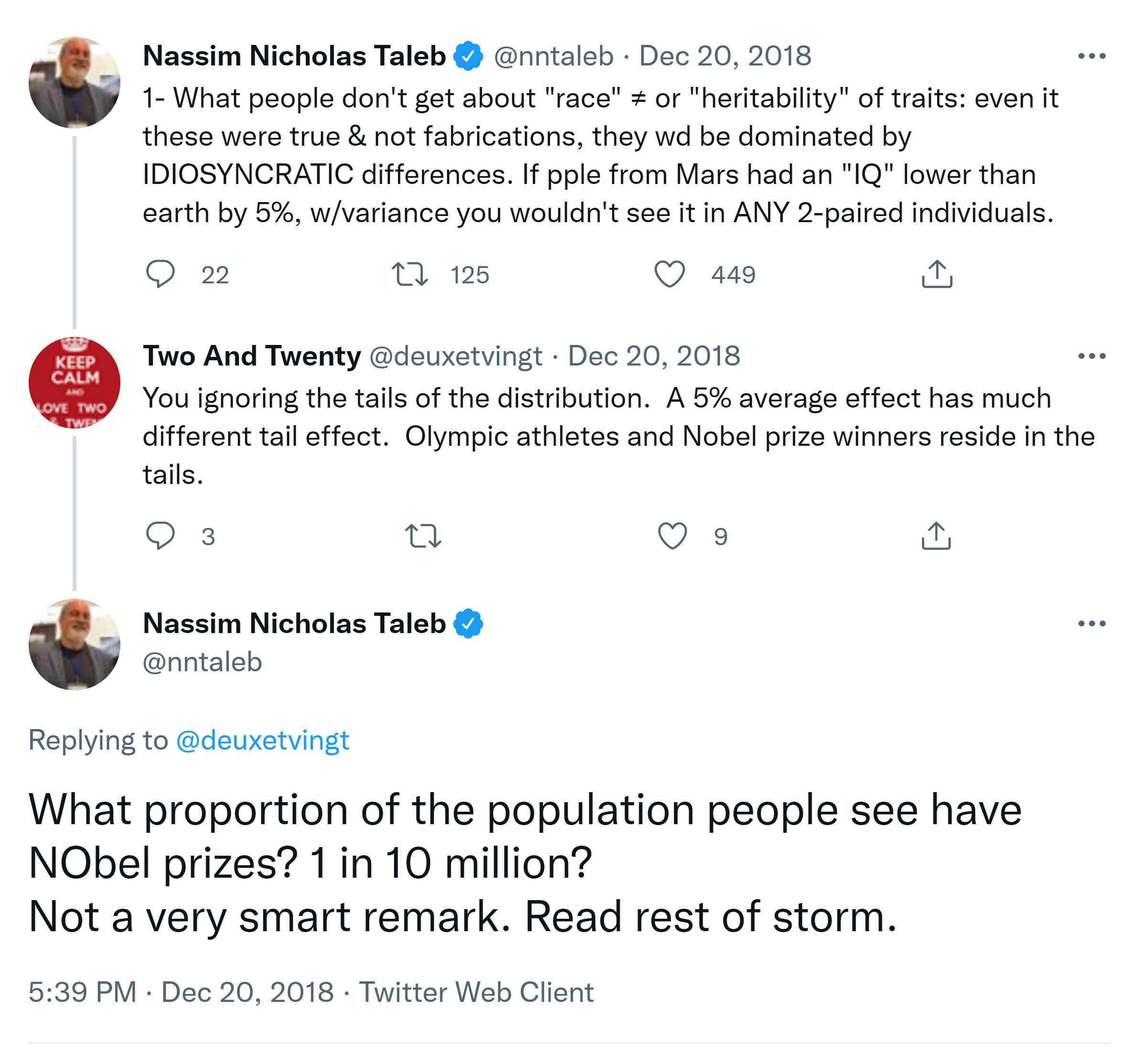 1- What people don’t get about “race” ≠ or “heritability” of traits: even it these were true & not fabrications, they wd be dominated by IDIOSYNCRATIC differences. If pple from Mars had an “IQ” lower than earth by 5%, w/variance you wouldn’t see it in ANY 2-paired individuals. What proportion of the population people see have NObel prizes? 1 in 10 million? Not a very smart remark. Read rest of storm.