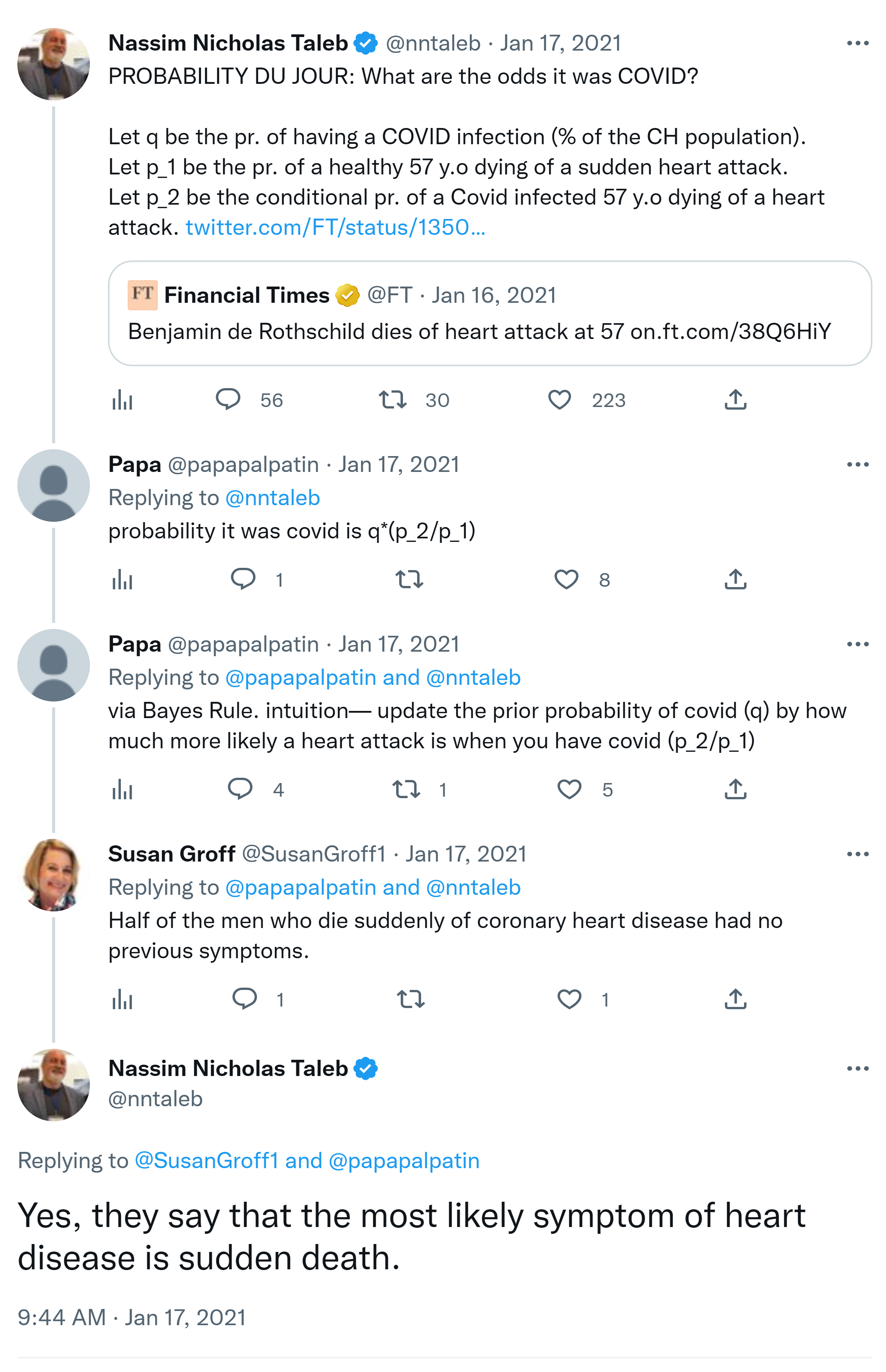 PROBABILITY DU JOUR: What are the odds it was COVID? Let q be the pr. of having a COVID infection (% of the CH population). Let p_1 be the pr. of a healthy 57 y.o dying of a sudden heart attack. Let p_2 be the conditional pr. of a Covid infected 57 y.o dying of a heart attack. https://twitter.com/FT/status/1350528377841733636 Yes, they say that the most likely symptom of heart disease is sudden death.