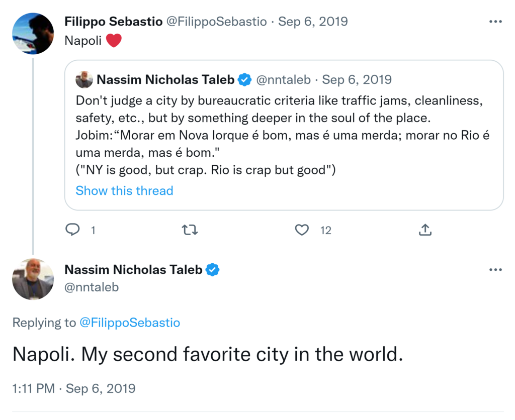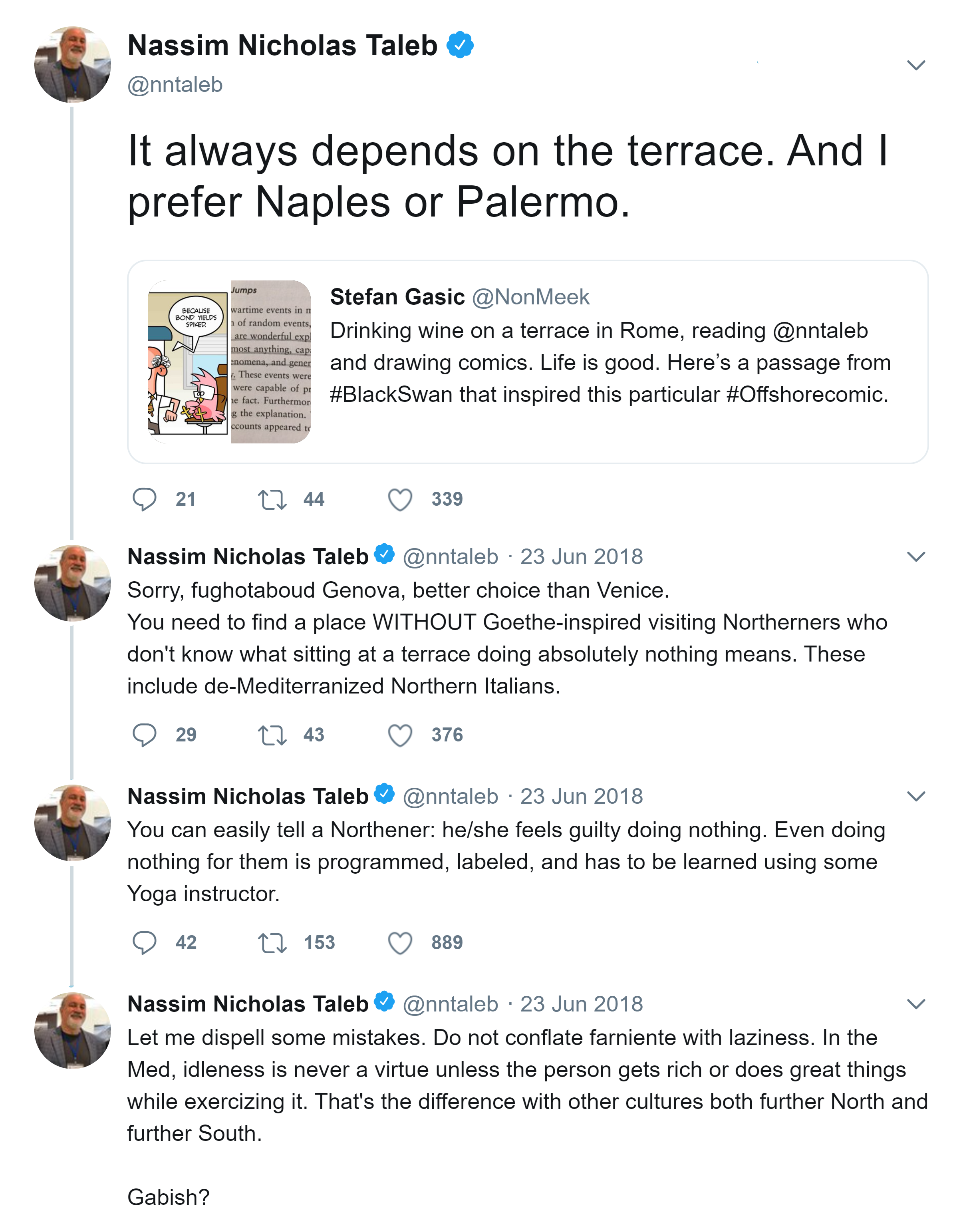 It always depends on the terrace. And I prefer Naples or Palermo. Sorry, fughotaboud Genova, better choice than Venice. You need to find a place WITHOUT Goethe-inspired visiting Northerners who don’t know what sitting at a terrace doing absolutely nothing means. These include de-Mediterranized Northern Italians. You can easily tell a Northener: he/she feels guilty doing nothing. Even doing nothing for them is programmed, labeled, and has to be learned using some Yoga instructor. Let me dispell some mistakes. Do not conflate farniente with laziness. In the Med, idleness is never a virtue unless the person gets rich or does great things while exercizing it. That’s the difference with other cultures both further North and further South. Gabish?
