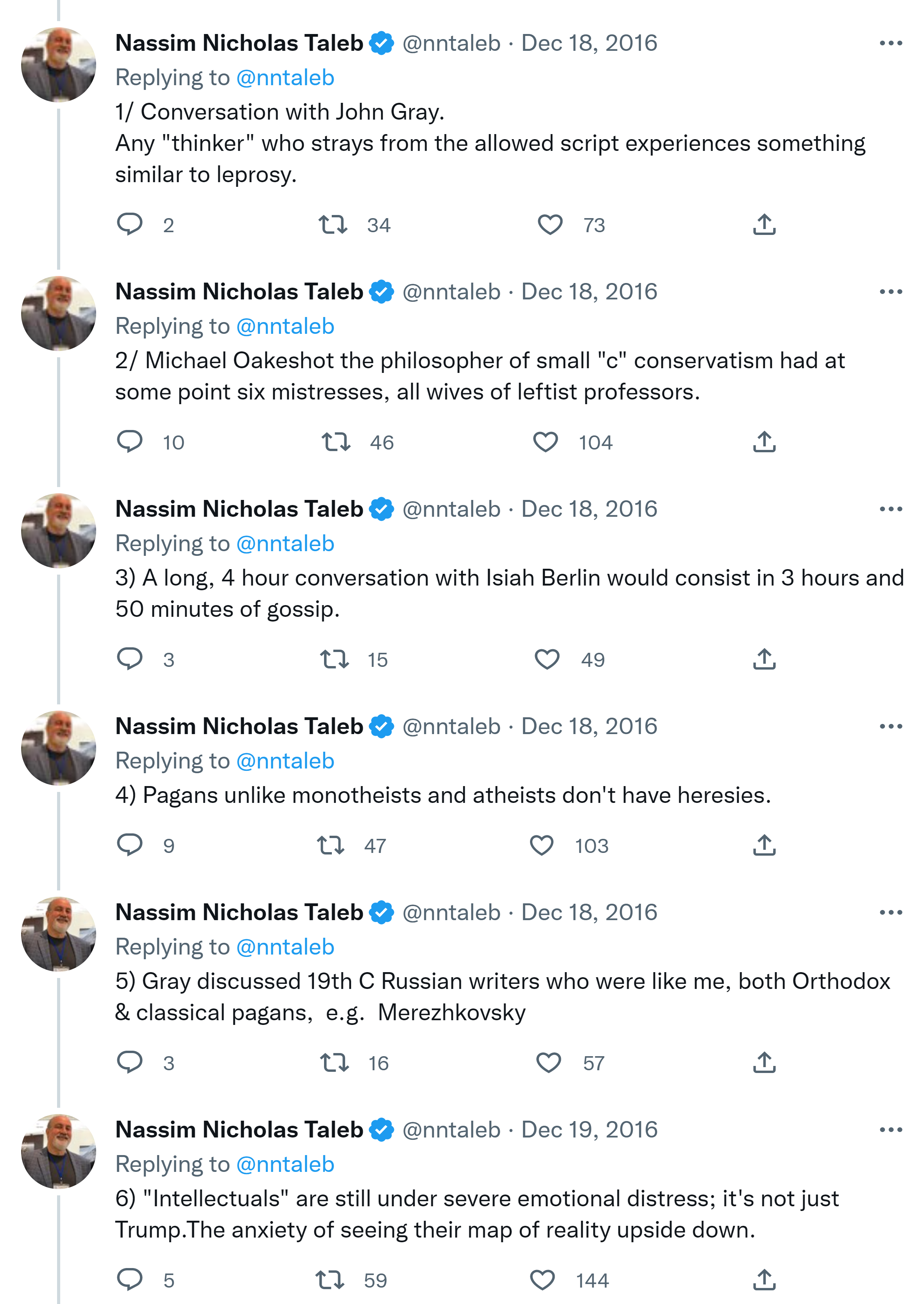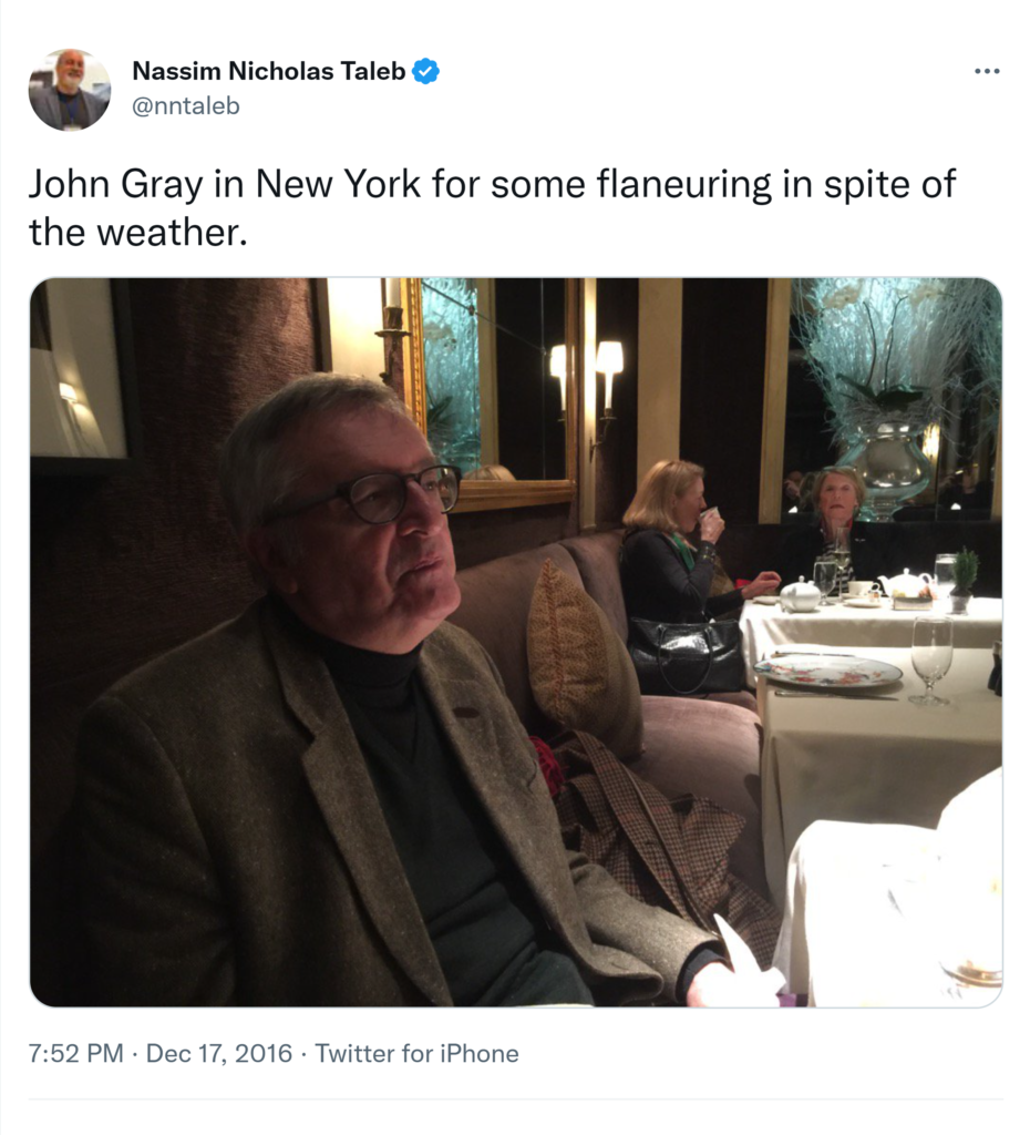 1/ Conversation with John Gray. Any “thinker” who strays from the allowed script experiences something similar to leprosy. 2/ Michael Oakeshot the philosopher of small “c” conservatism had at some point six mistresses, all wives of leftist professors. 3) A long, 4 hour conversation with Isiah Berlin would consist in 3 hours and 50 minutes of gossip. 4) Pagans unlike monotheists and atheists don’t have heresies.5) Gray discussed 19th C Russian writers who were like me, both Orthodox & classical pagans, e.g. Merezhkovsky