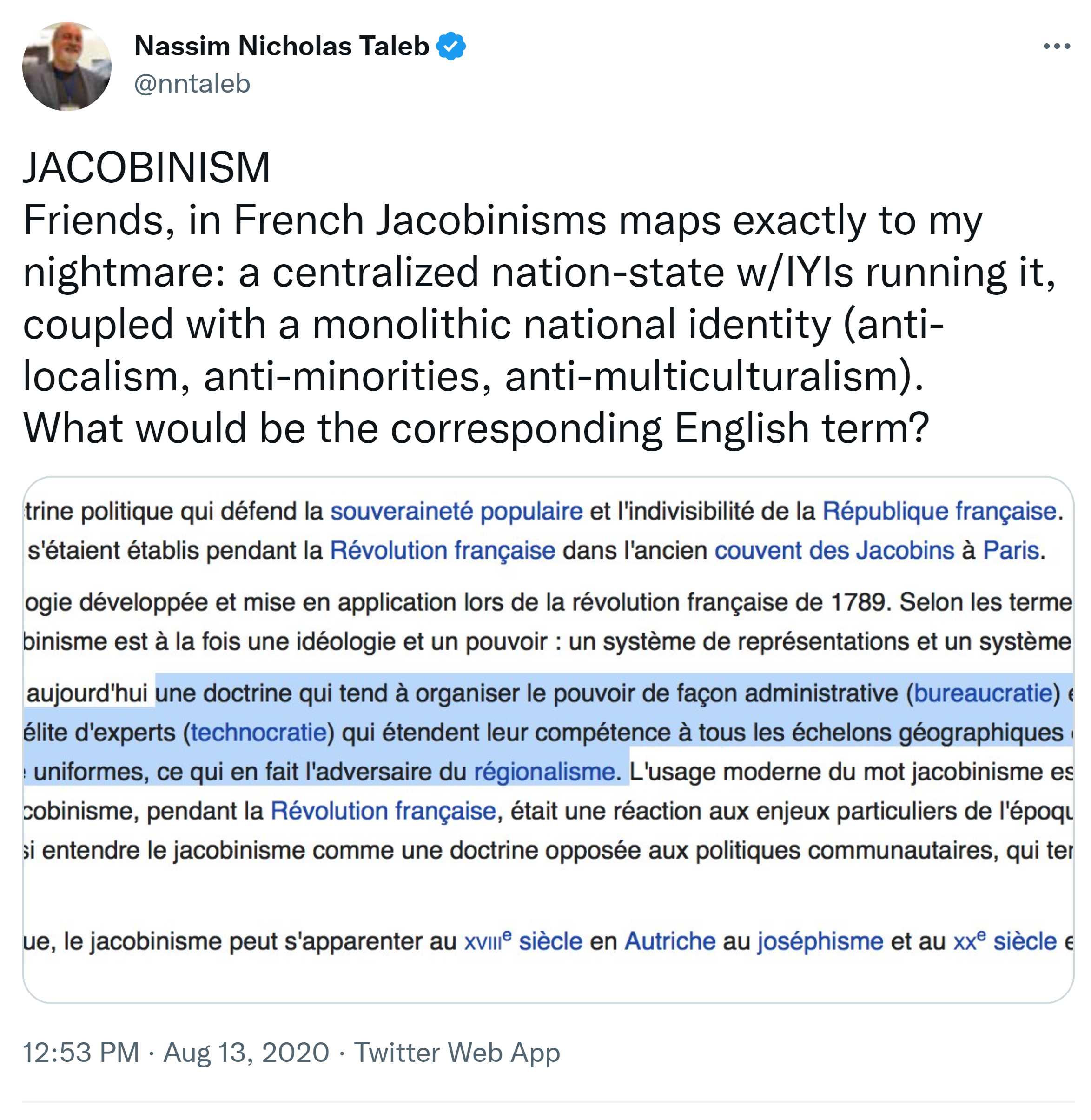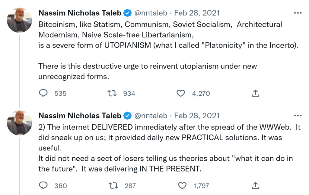 Bitcoinism, like Statism, Communism, Soviet Socialism, Architectural Modernism, Naive Scale-free Libertarianism, is a severe form of UTOPIANISM (what I called “Platonicity” in the Incerto). There is this destructive urge to reinvent utopianism under new unrecognized forms. 2) The internet DELIVERED immediately after the spread of the WWWeb. It did sneak up on us; it provided daily new PRACTICAL solutions. It was useful. It did not need a sect of losers telling us theories about “what it can do in the future”. It was delivering IN THE PRESENT.