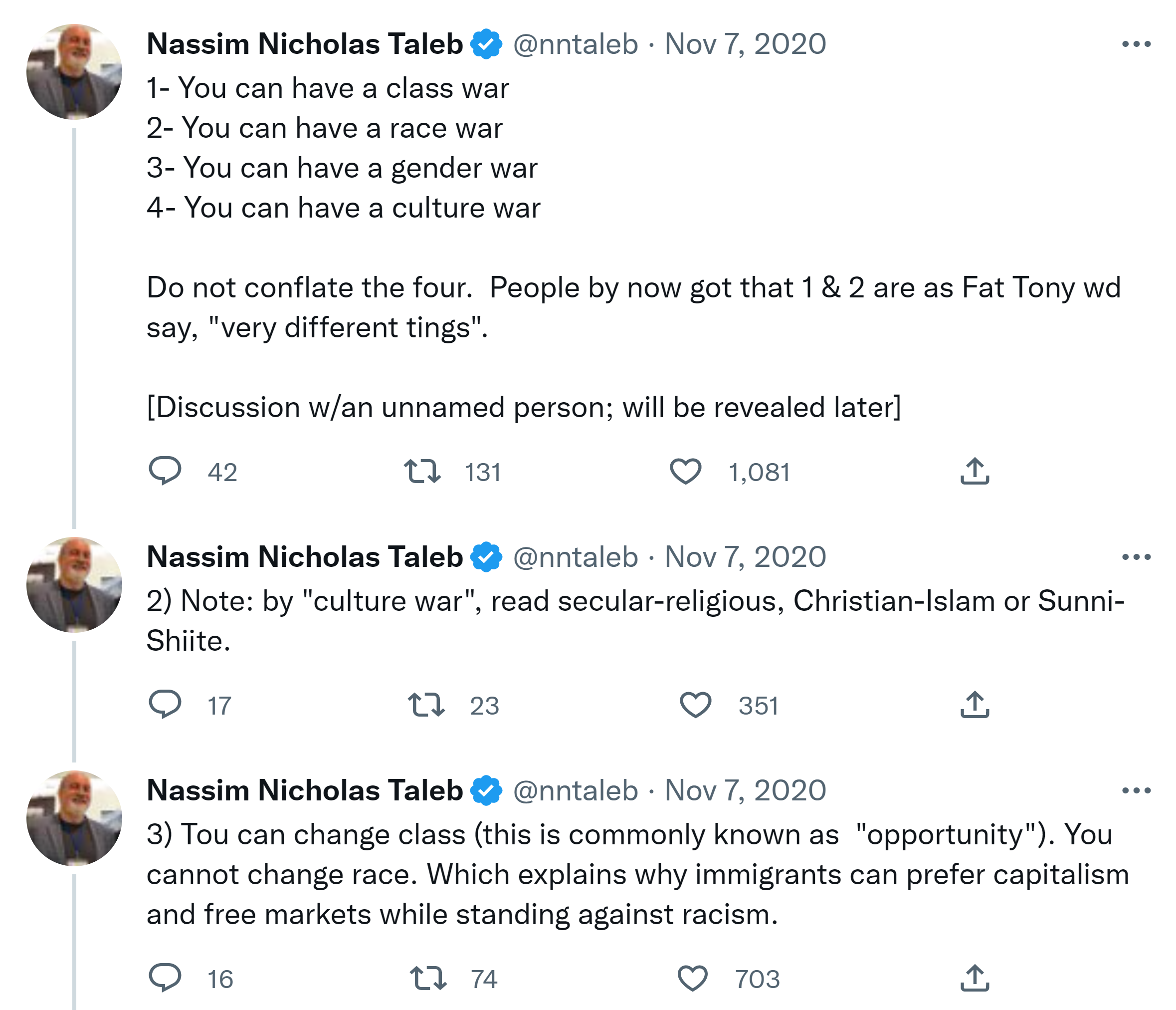1- You can have a class war 2- You can have a race war 3- You can have a gender war 4- You can have a culture war Do not conflate the four. People by now got that 1 & 2 are as Fat Tony wd say, “very different tings”. [Discussion w/an unnamed person; will be revealed later] 2) Note: by “culture war”, read secular-religious, Christian-Islam or Sunni-Shiite. 3) Tou can change class (this is commonly known as “opportunity”). You cannot change race. Which explains why immigrants can prefer capitalism and free markets while standing against racism.