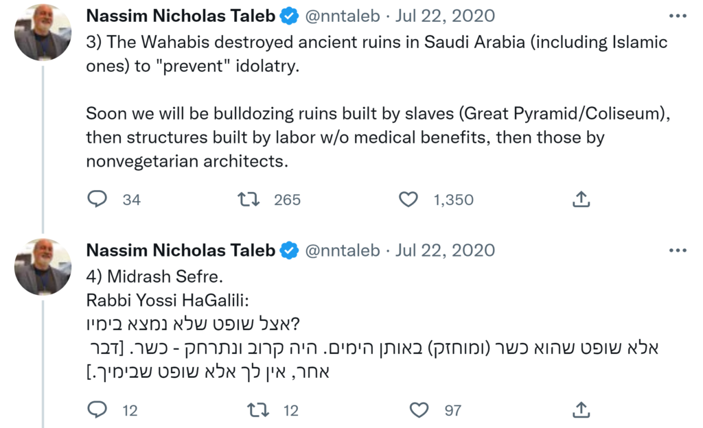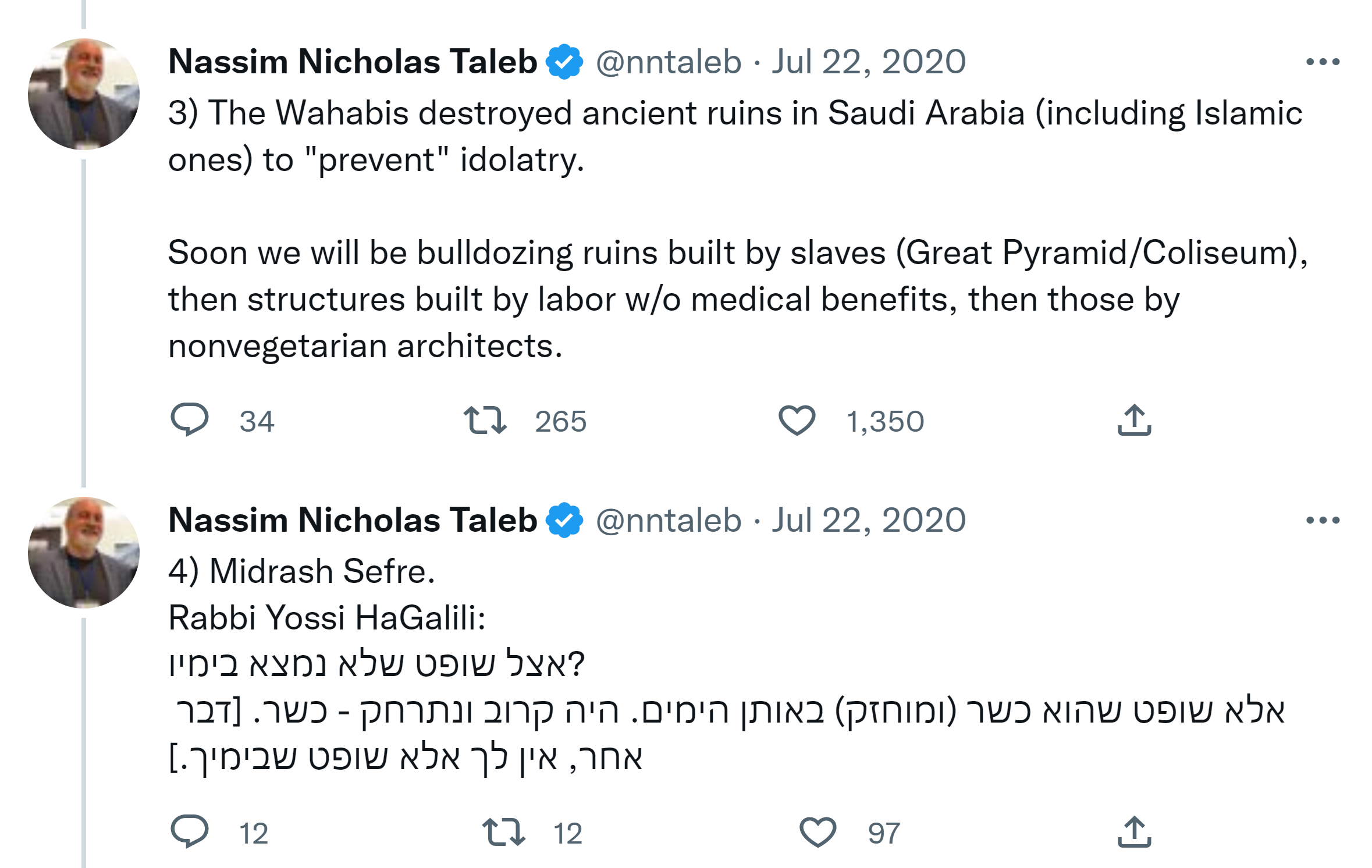 The NYT suggests cancelling Aristotle. This is retrospective bigotteering; it implies moral values DO NOT evolve. People need to be judged with respect to the morals OF THEIR OWN TIME. (But we can be harsh w/Napoleon who reinstated slavery.) 2/ By retrospective bigotteering, they will end up canceling ALL their ancestors, 99.9% of the contents of libraries and any institution older than 5 years will eventually end up canceling itself. (Yes I know the NYT ends up “opposed” to the idea of “cancelling Aristotle”, but the mere fact that they suggest the possibility …) 3) The Wahabis destroyed ancient ruins in Saudi Arabia (including Islamic ones) to “prevent” idolatry. Soon we will be bulldozing ruins built by slaves (Great Pyramid/Coliseum), then structures built by labor w/o medical benefits, then those by nonvegetarian architects. 4) Midrash Sefre. Rabbi Yossi HaGalili: אצל שופט שלא נמצא בימיו? אלא שופט שהוא כשר (ומוחזק) באותן הימים. היה קרוב ונתרחק – כשר. [דבר אחר, אין לך אלא שופט שבימיך.]