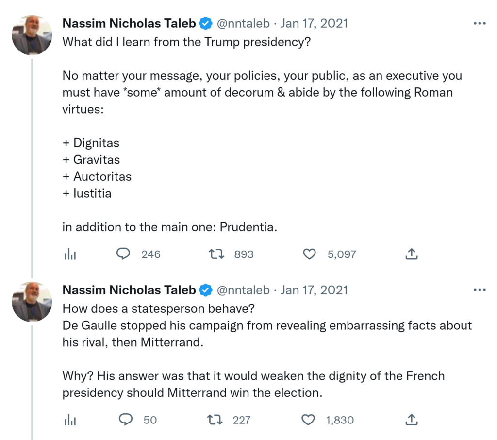 What did I learn from the Trump presidency? No matter your message, your policies, your public, as an executive you must have *some* amount of decorum & abide by the following Roman virtues: + Dignitas + Gravitas + Auctoritas + Iustitia in addition to the main one: Prudentia. How does a statesperson behave? De Gaulle stopped his campaign from revealing embarrassing facts about his rival, then Mitterrand. Why? His answer was that it would weaken the dignity of the French presidency should Mitterrand win the election