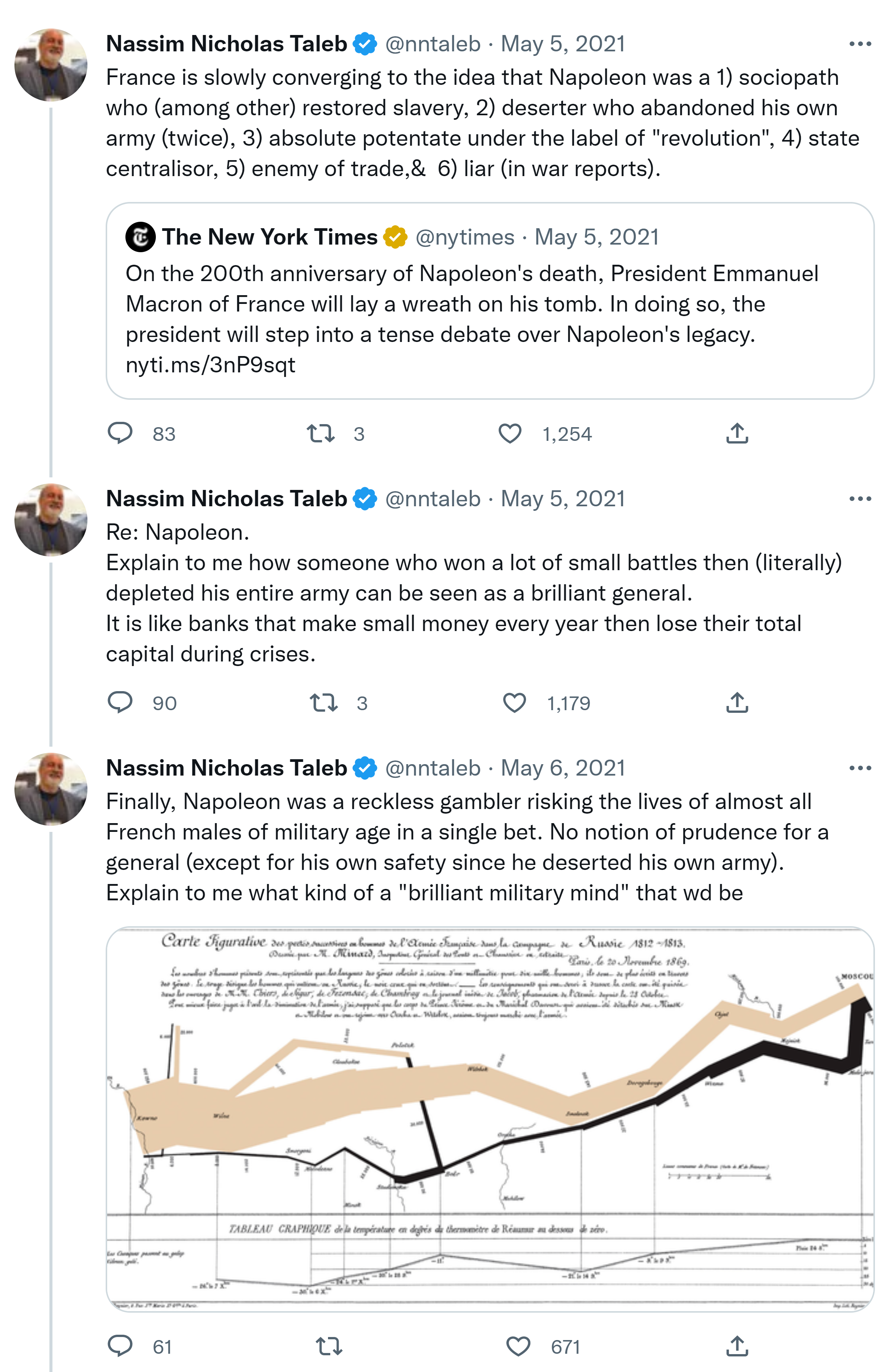 France is slowly converging to the idea that Napoleon was a 1) sociopath who (among other) restored slavery, 2) deserter who abandoned his own army (twice), 3) absolute potentate under the label of “revolution”, 4) state centralisor, 5) enemy of trade,& 6) liar (in war reports). Re: Napoleon. Explain to me how someone who won a lot of small battles then (literally) depleted his entire army can be seen as a brilliant general. It is like banks that make small money every year then lose their total capital during crises. Finally, Napoleon was a reckless gambler risking the lives of almost all French males of military age in a single bet. No notion of prudence for a general (except for his own safety since he deserted his own army). Explain to me what kind of a “brilliant military mind” that wd be