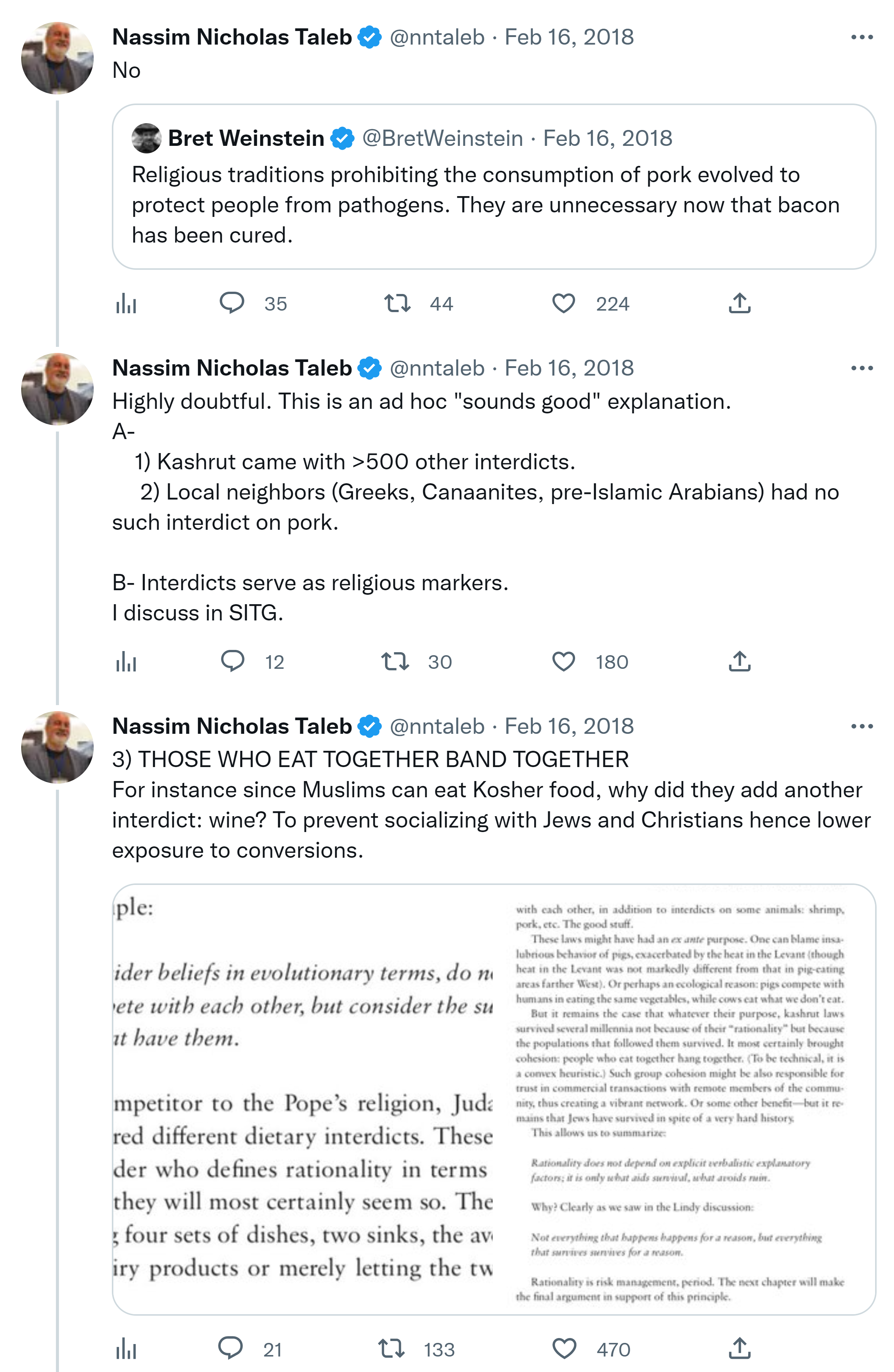 Highly doubtful. This is an ad hoc “sounds good” explanation. A- 1) Kashrut came with >500 other interdicts. 2) Local neighbors (Greeks, Canaanites, pre-Islamic Arabians) had no such interdict on pork. B- Interdicts serve as religious markers. I discuss in SITG. 3) THOSE WHO EAT TOGETHER BAND TOGETHER For instance since Muslims can eat Kosher food, why did they add another interdict: wine? To prevent socializing with Jews and Christians hence lower exposure to conversions.