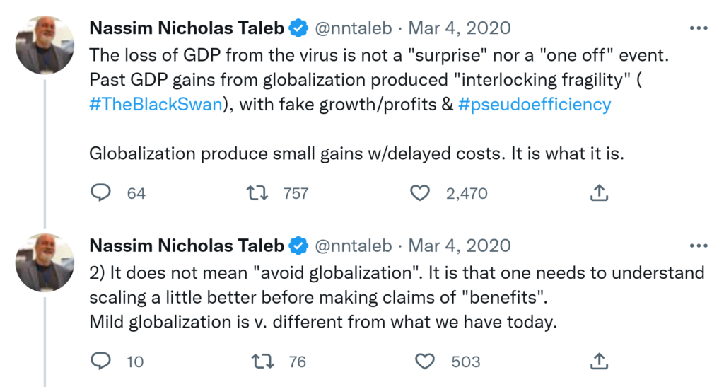 The loss of GDP from the virus is not a “surprise” nor a “one off” event. Past GDP gains from globalization produced “interlocking fragility” ( #TheBlackSwan), with fake growth/profits & #pseudoefficiency Globalization produce small gains w/delayed costs. It is what it is. 2) It does not mean “avoid globalization”. It is that one needs to understand scaling a little better before making claims of “benefits”. Mild globalization is v. different from what we have today.