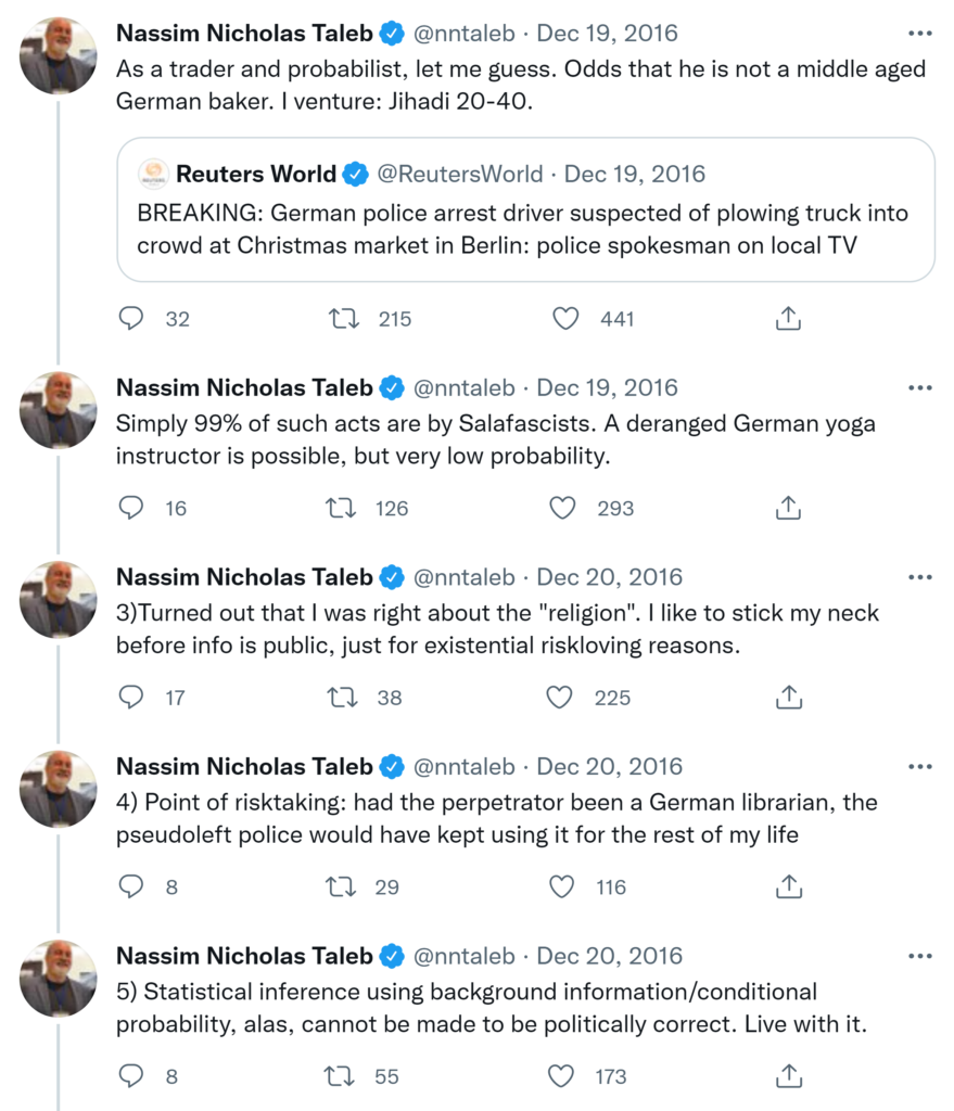 As a trader and probabilist, let me guess. Odds that he is not a middle aged German baker. I venture: Jihadi 20-40. Simply 99% of such acts are by Salafascists. A deranged German yoga instructor is possible, but very low probability. 3)Turned out that I was right about the “religion”. I like to stick my neck before info is public, just for existential riskloving reasons.4) Point of risktaking: had the perpetrator been a German librarian, the pseudoleft police would have kept using it for the rest of my life 5) Statistical inference using background information/conditional probability, alas, cannot be made to be politically correct. Live with it.