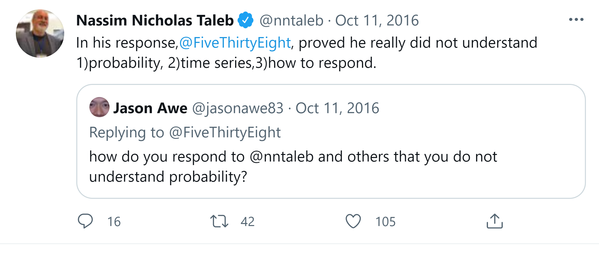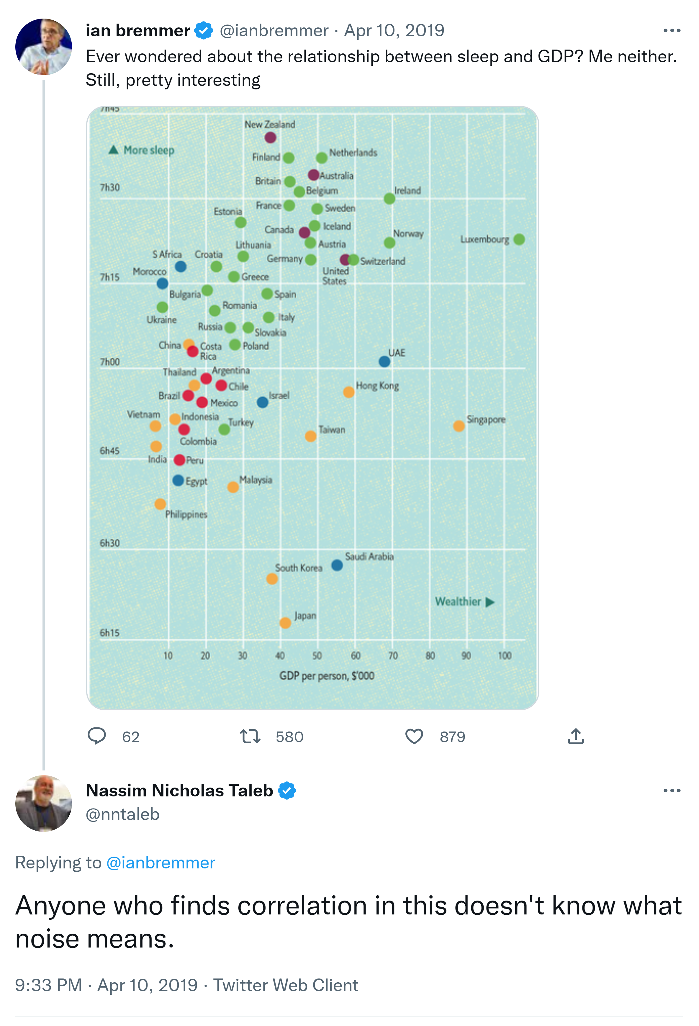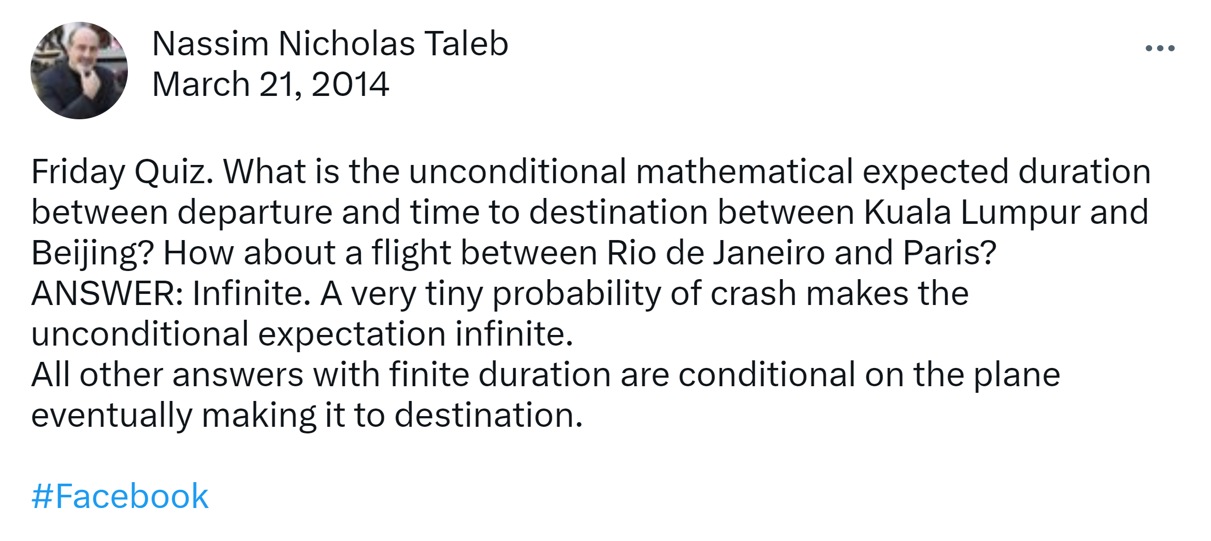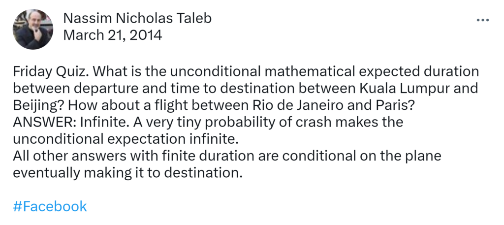 Friday Quiz. What is the unconditional mathematical expected duration between departure and time to destination between Kuala Lumpur and Beijing? How about a flight between Rio de Janeiro and Paris? ANSWER: Infinite. A very tiny probability of crash makes the unconditional expectation infinite. All other answers with finite duration are conditional on the plane eventually making it to destination.
