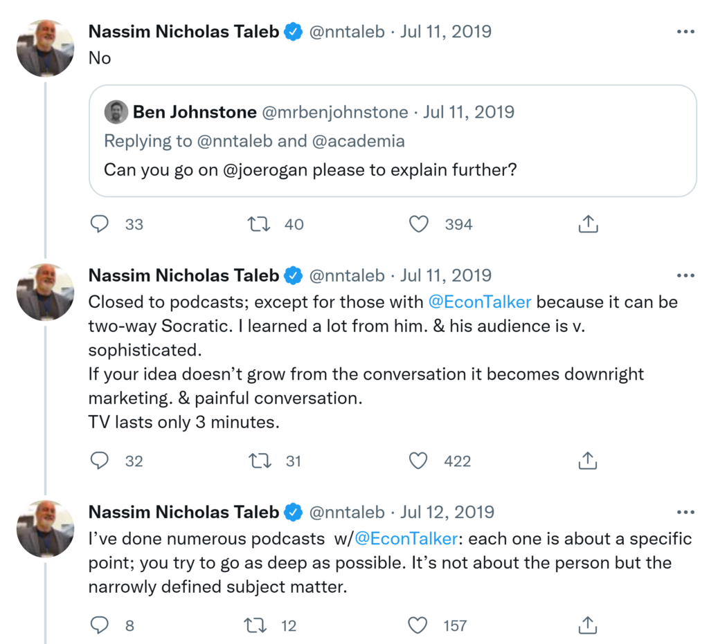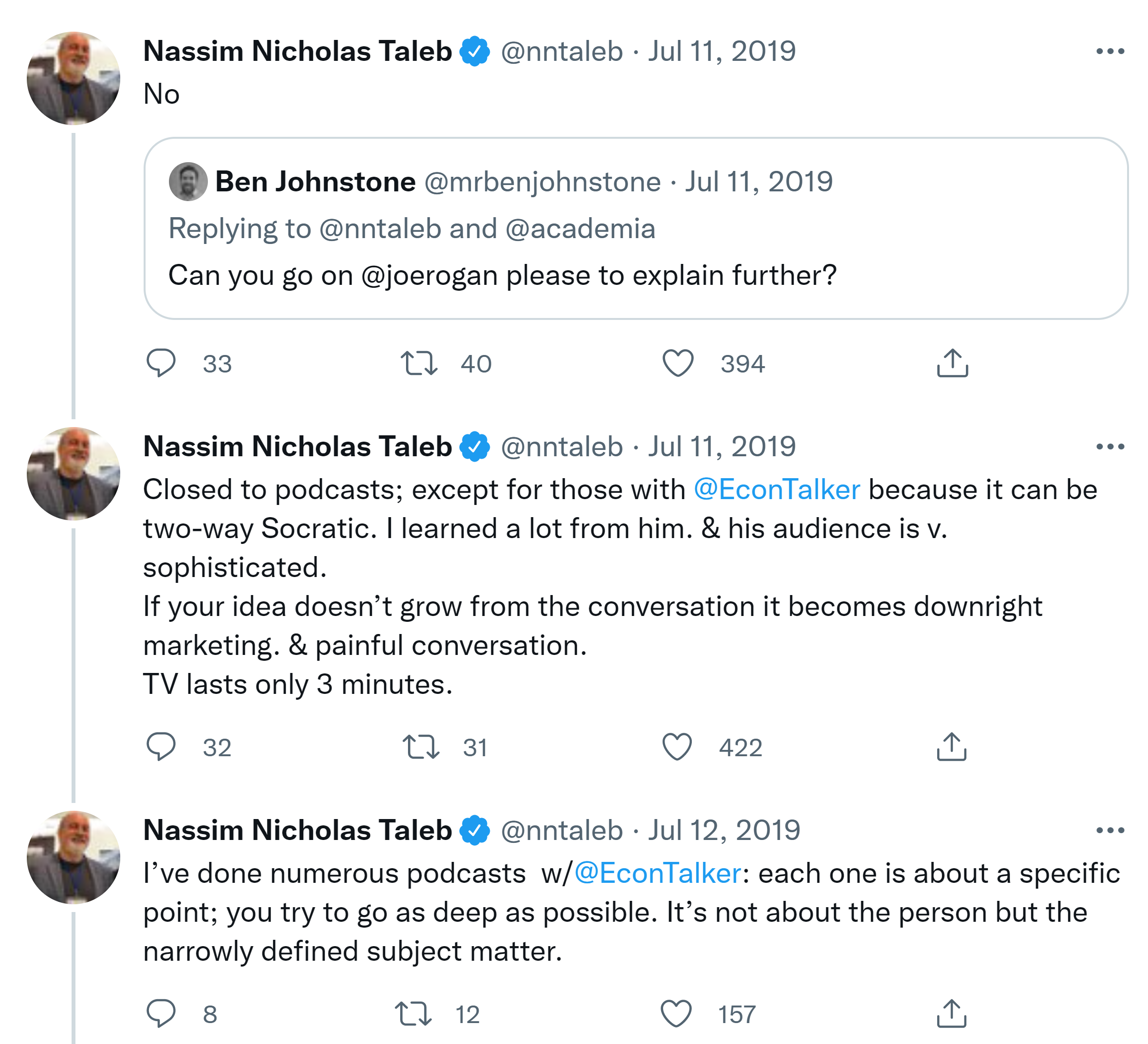 Closed to podcasts; except for those with @EconTalker because it can be two-way Socratic. I learned a lot from him. & his audience is v. sophisticated. If your idea doesn’t grow from the conversation it becomes downright marketing. & painful conversation. TV lasts only 3 minutes. I’ve done numerous podcasts w/ @EconTalker : each one is about a specific point; you try to go as deep as possible. It’s not about the person but the narrowly defined subject matter.
