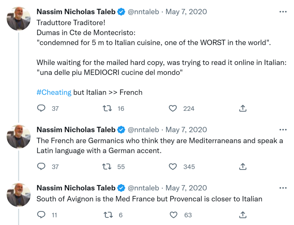 Traduttore Traditore! Dumas in Cte de Montecristo: “condemned for 5 m to Italian cuisine, one of the WORST in the world”. While waiting for the mailed hard copy, was trying to read it online in Italian: “una delle piu MEDIOCRI cucine del mondo” The French are Germanics who think they are Mediterraneans and speak a Latin language with a German accent. South of Avignon is the Med France but Provencal is closer to Italian