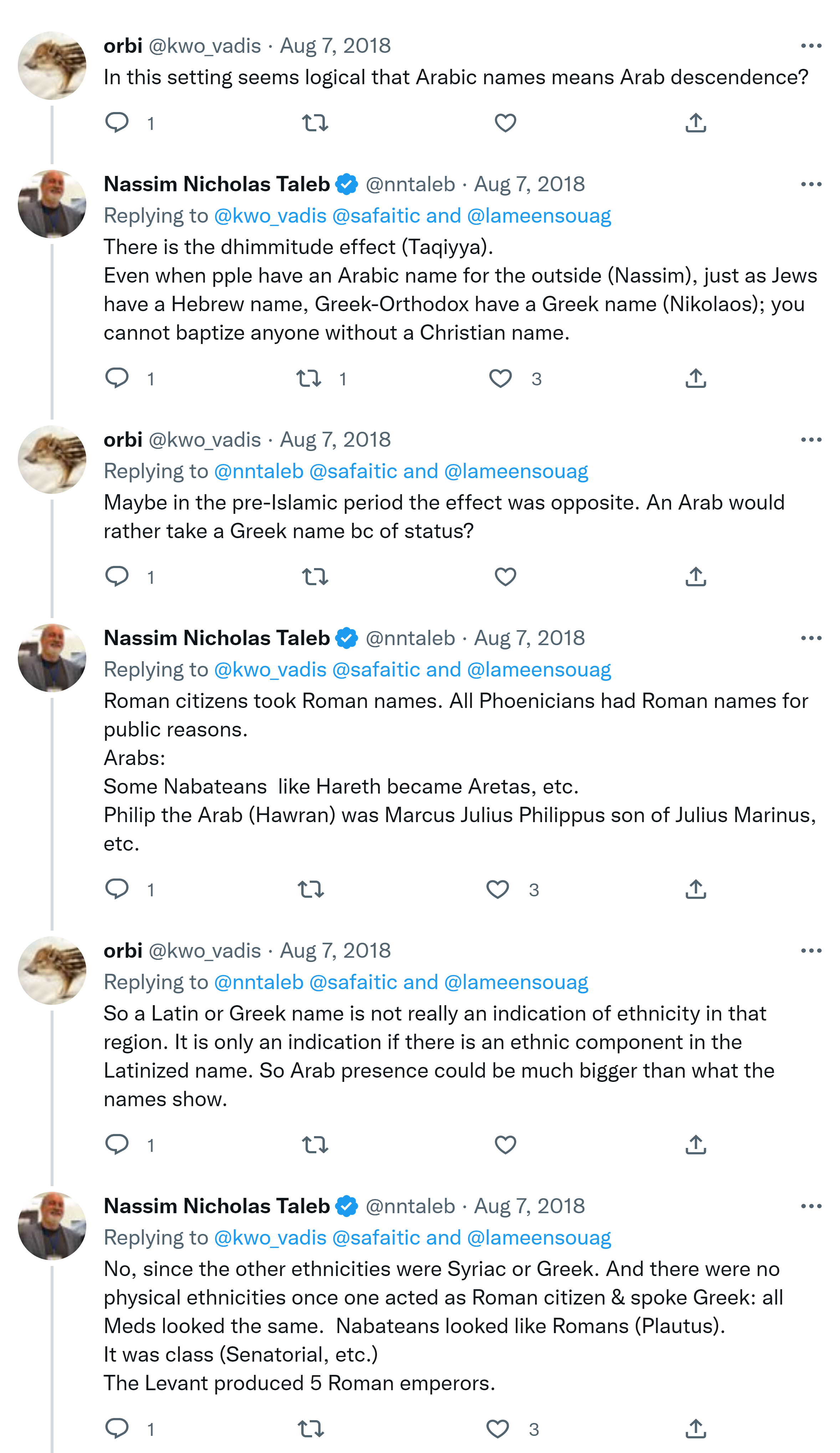 There is the dhimmitude effect (Taqiyya). Even when pple have an Arabic name for the outside (Nassim), just as Jews have a Hebrew name, Greek-Orthodox have a Greek name (Nikolaos); you cannot baptize anyone without a Christian name. Roman citizens took Roman names. All Phoenicians had Roman names for public reasons. Arabs: Some Nabateans like Hareth became Aretas, etc. Philip the Arab (Hawran) was Marcus Julius Philippus son of Julius Marinus, etc. No, since the other ethnicities were Syriac or Greek. And there were no physical ethnicities once one acted as Roman citizen & spoke Greek: all Meds looked the same. Nabateans looked like Romans (Plautus). It was class (Senatorial, etc.) The Levant produced 5 Roman emperors.
