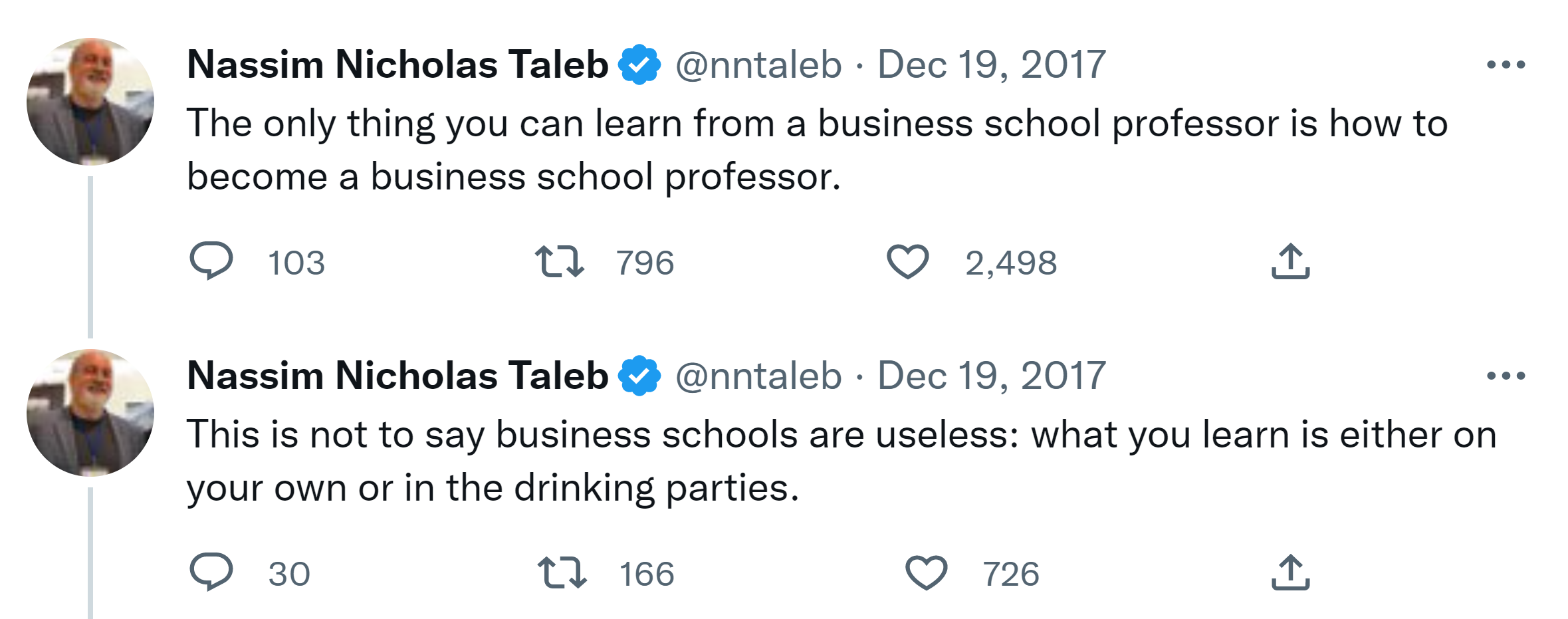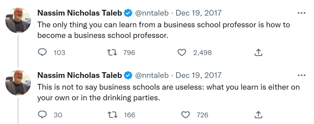 This is the kind of bullshit delivered by a BSchool “Associate Dean”. Dangerous BS. Saying “data has fat tails” YET using ordinary MLE estimators, accepting modern portfolio theory, calculating CVaR, regressions, doing business as usual, is INCOHERENT. http://fooledbyrandomness.com/FatTails.html Econs: In the age of social media, you can’t keep selling BS with pseudo-mathematics/citation ring/circular vetting with impunity. Eventually a bubble bursts.