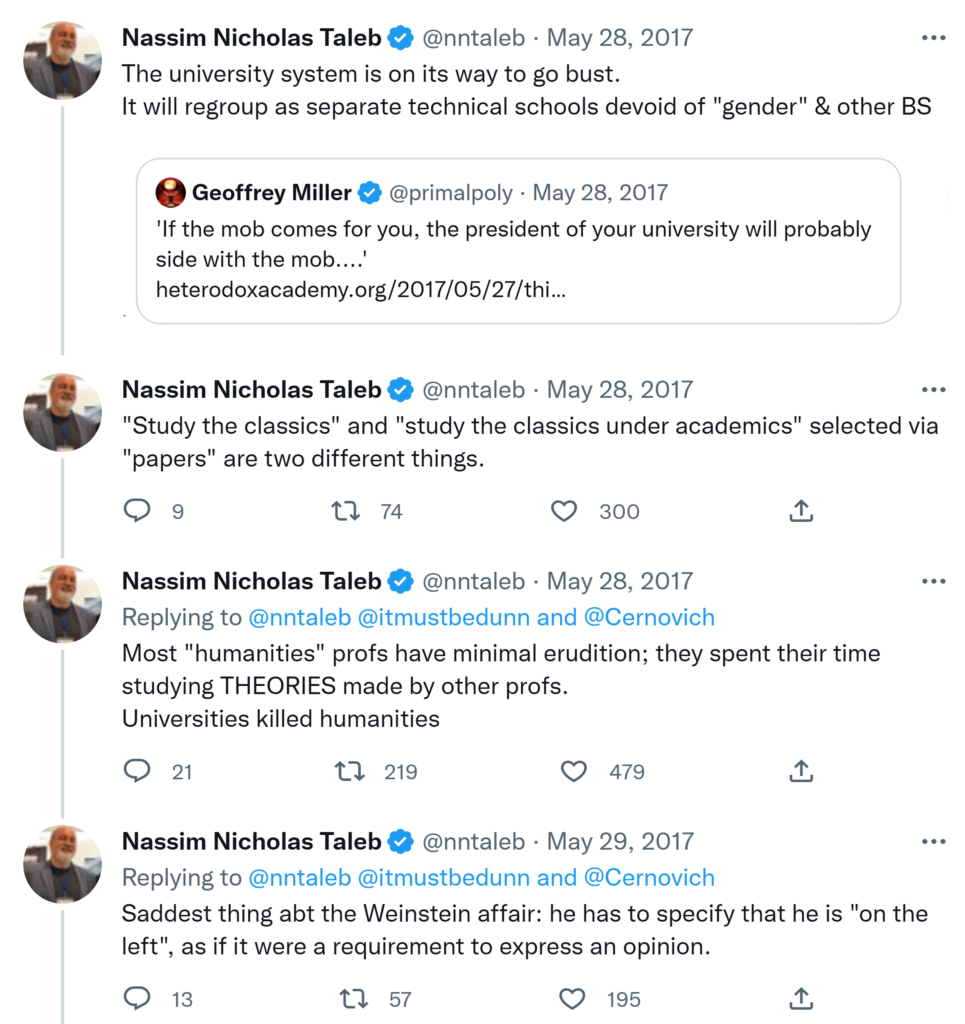 The university system is on its way to go bus t. It will regroup as separate technical schools devoid of “gender” & other BS studies. “Study the classics” and “study the classics under academics” selected via “papers” are two different things. Most “humanities” profs have minimal erudition; they spent their time studying THEORIES made by other profs. Universities killed humanities Saddest thing abt the Weinstein affair: he has to specify that he is “on the left”, as if it were a requirement to express an opinion.