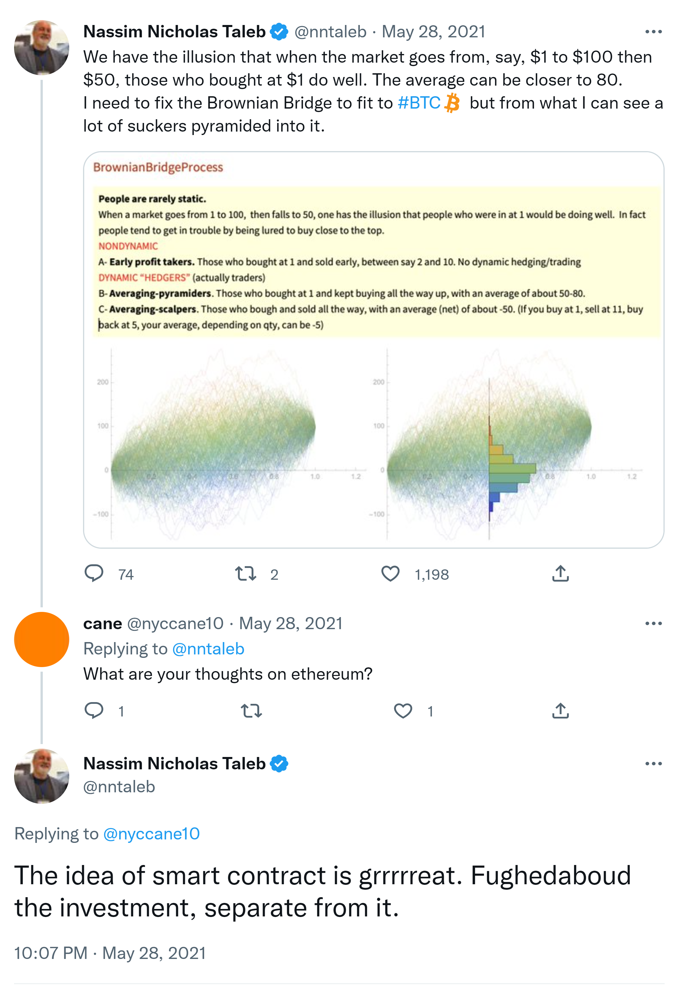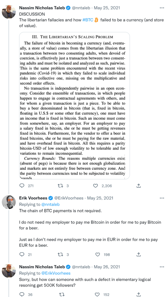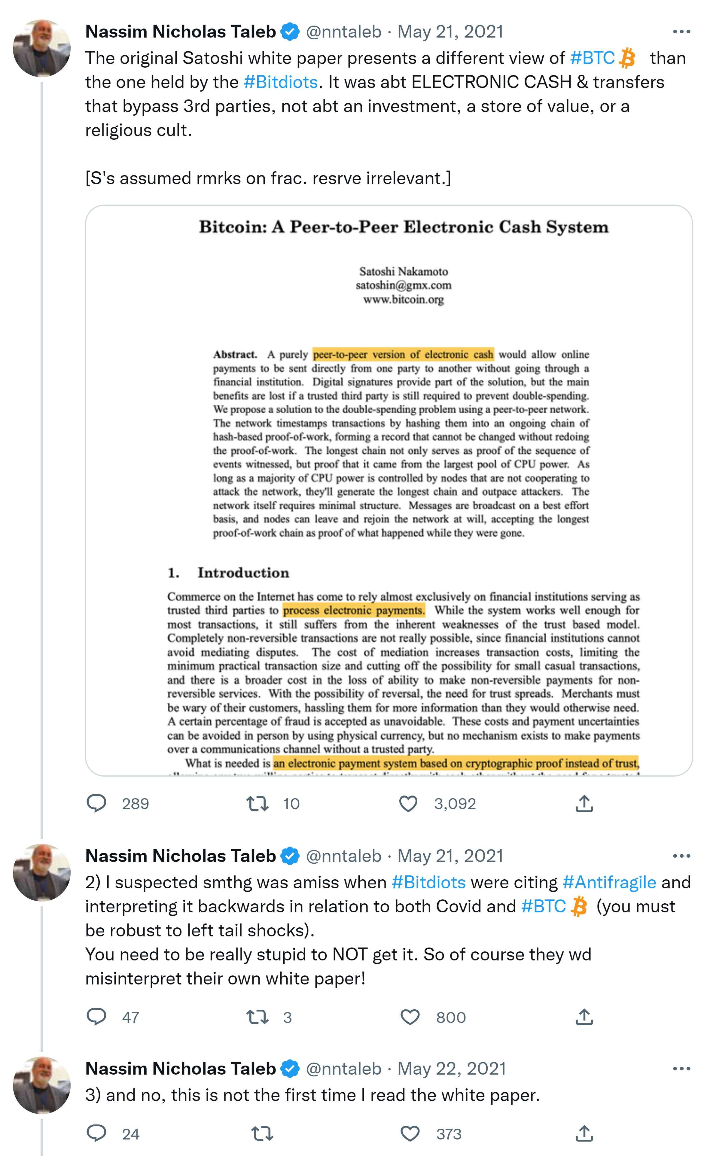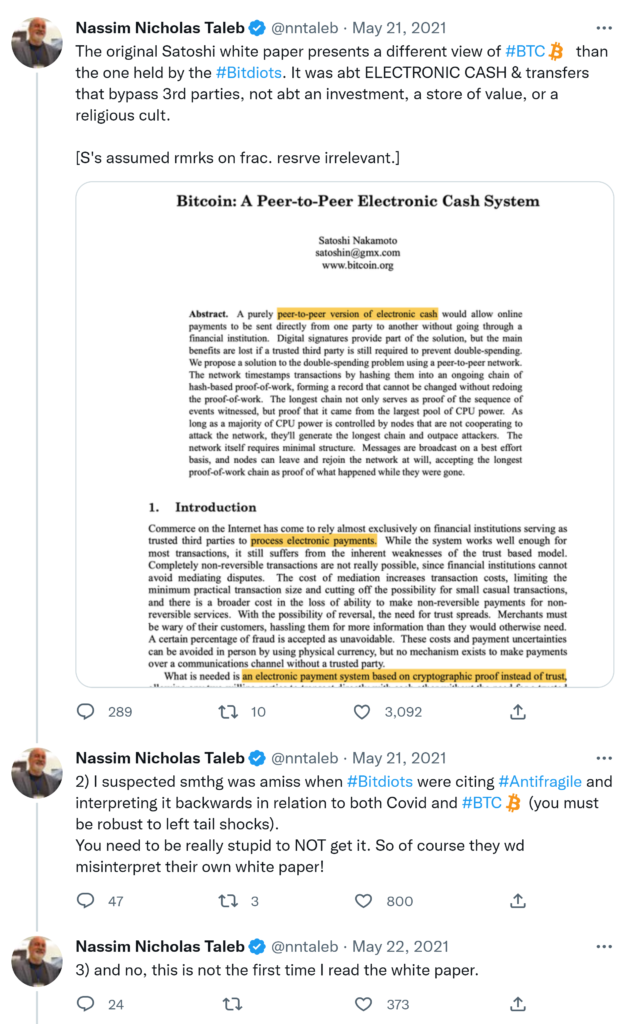 The original Satoshi white paper presents a different view of #BTC than the one held by the #Bitdiots. It was abt ELECTRONIC CASH & transfers that bypass 3rd parties, not abt an investment, a store of value, or a religious cult. [S’s assumed rmrks on frac. resrve irrelevant.] Nassim Nicholas Taleb @nntaleb · May 21, 2021 Replying to @nntaleb 2) I suspected smthg was amiss when #Bitdiots were citing #Antifragile and interpreting it backwards in relation to both Covid and #BTC (you must be robust to left tail shocks). You need to be really stupid to NOT get it. So of course they wd misinterpret their own white paper!3) and no, this is not the first time I read the white paper.