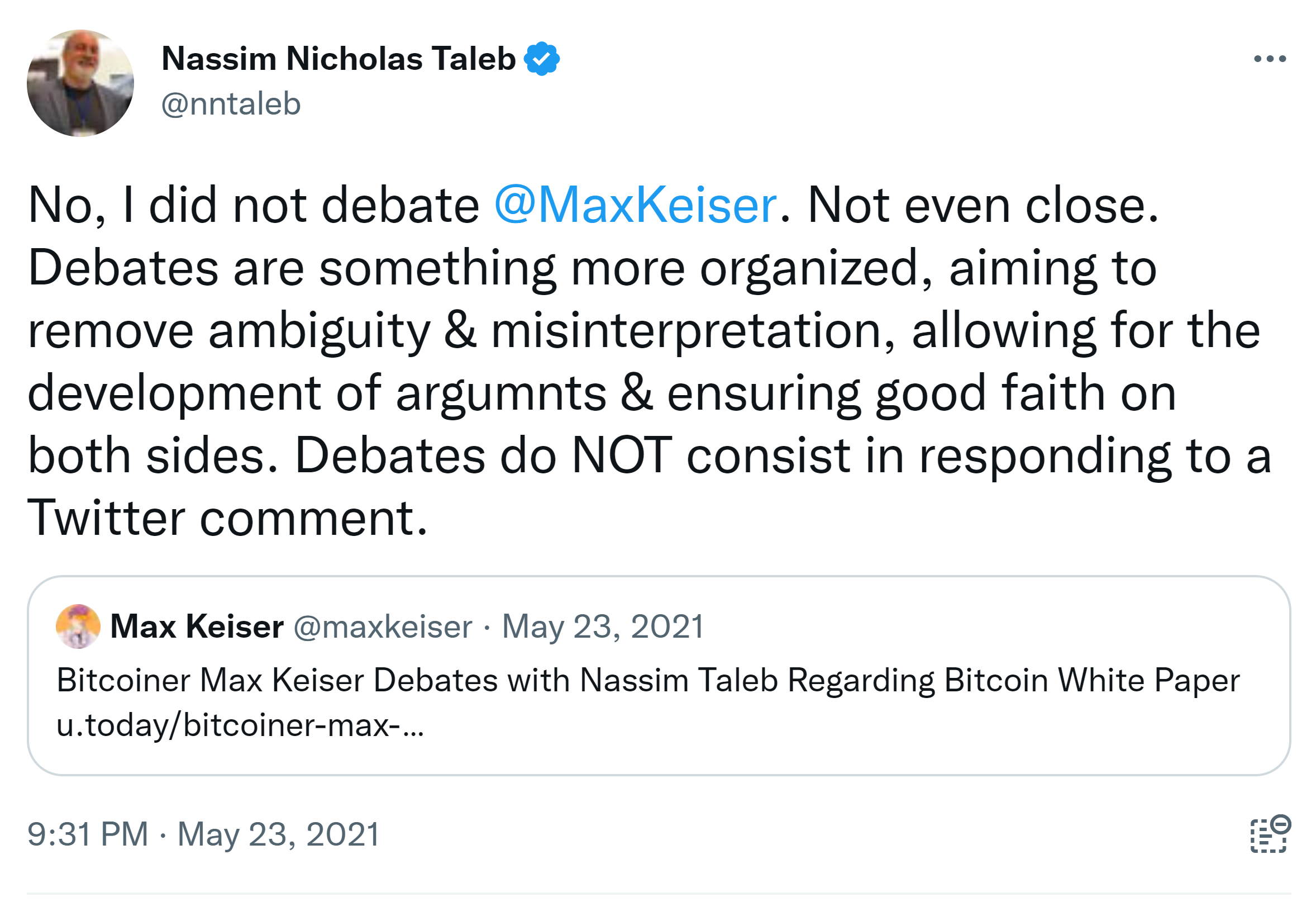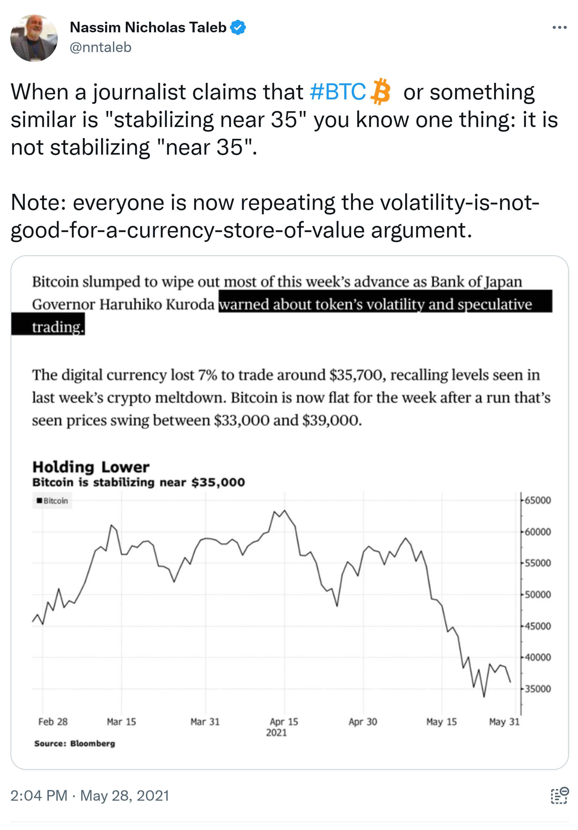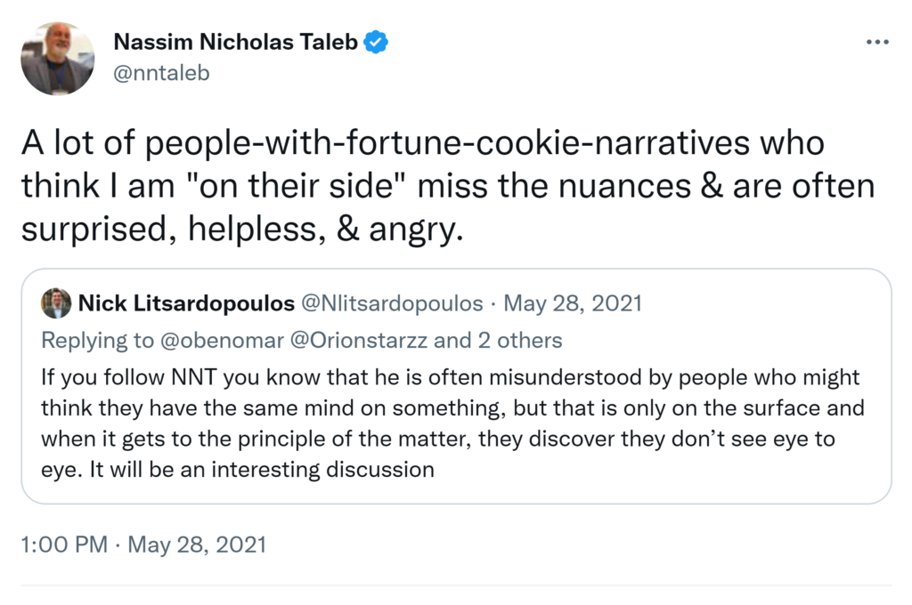 The original Satoshi white paper presents a different view of #BTC than the one held by the #Bitdiots. It was abt ELECTRONIC CASH & transfers that bypass 3rd parties, not abt an investment, a store of value, or a religious cult. [S’s assumed rmrks on frac. resrve irrelevant.] Nassim Nicholas Taleb @nntaleb · May 21, 2021 Replying to @nntaleb 2) I suspected smthg was amiss when #Bitdiots were citing #Antifragile and interpreting it backwards in relation to both Covid and #BTC (you must be robust to left tail shocks). You need to be really stupid to NOT get it. So of course they wd misinterpret their own white paper!3) and no, this is not the first time I read the white paper.