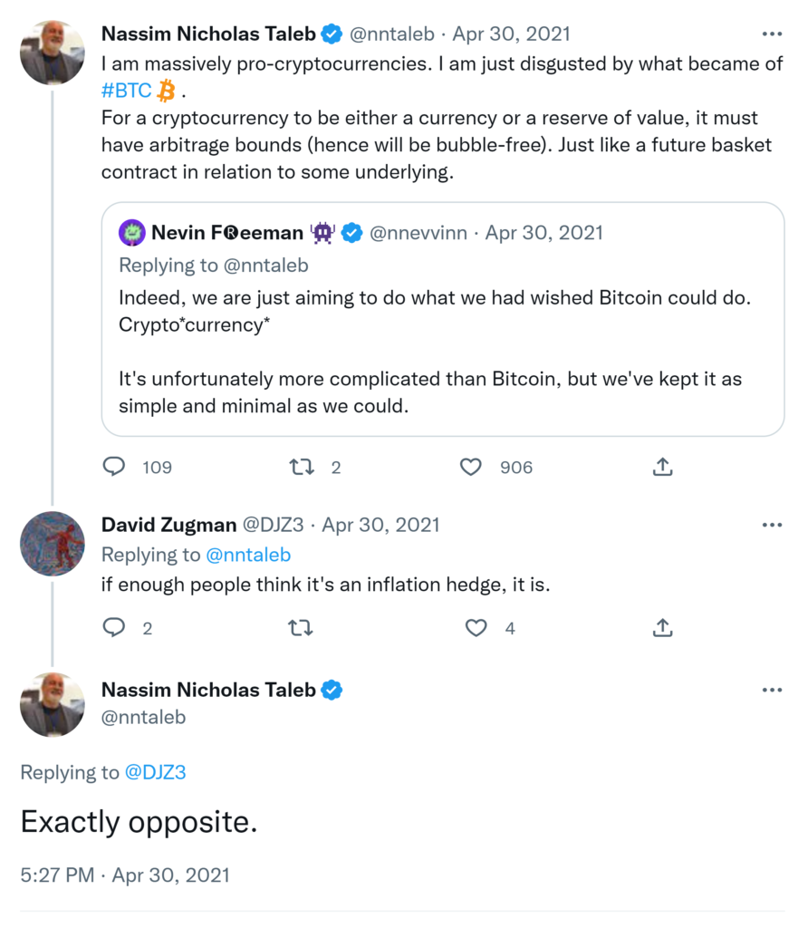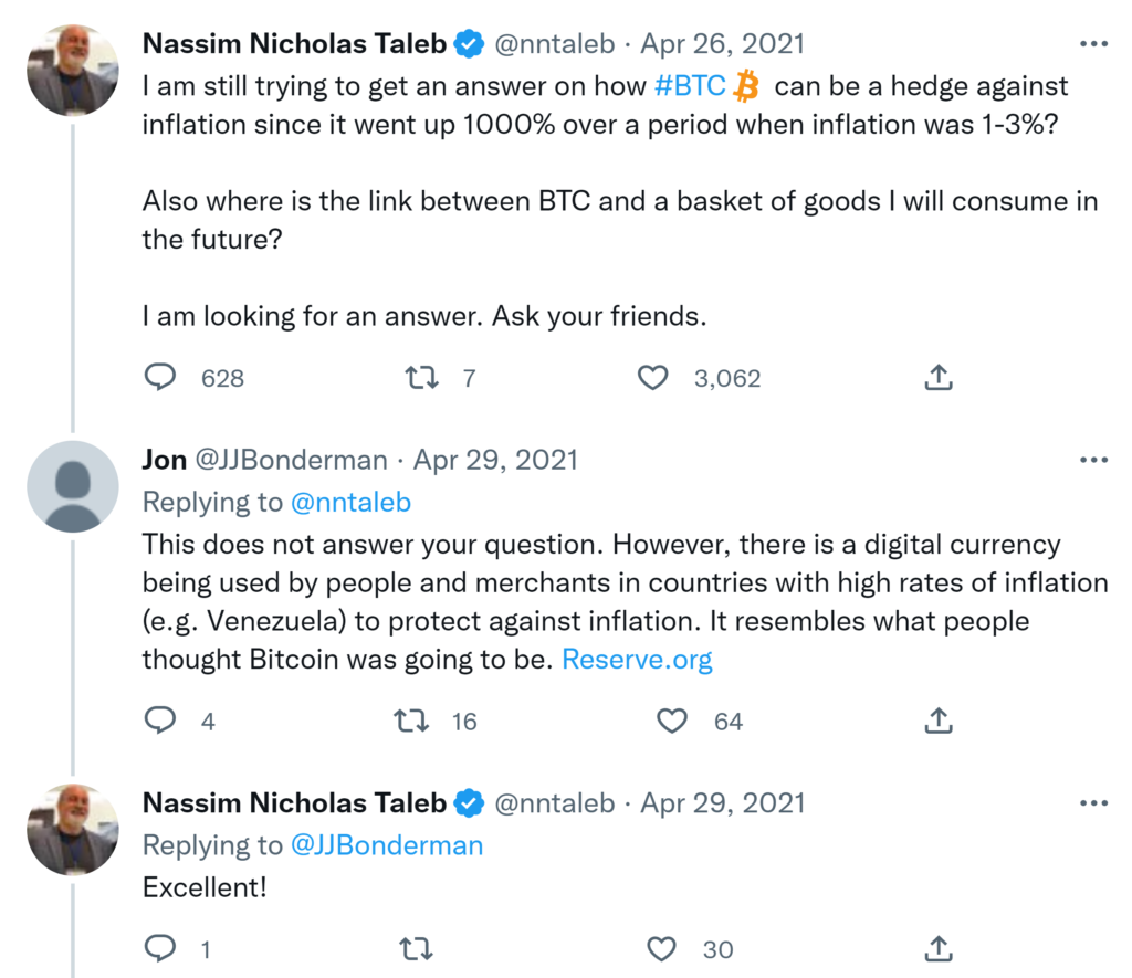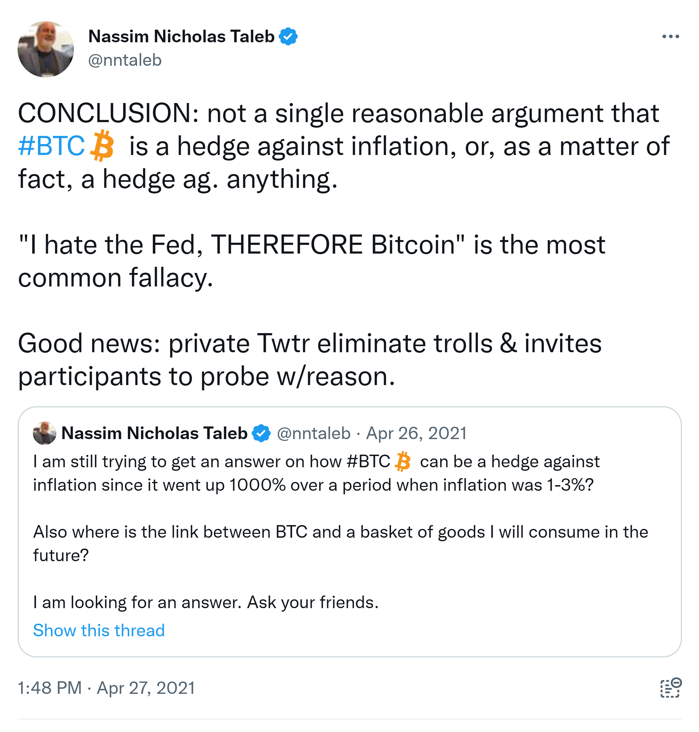 CONCLUSION: not a single reasonable argument that #BTC is a hedge against inflation, or, as a matter of fact, a hedge ag. anything. “I hate the Fed, THEREFORE Bitcoin” is the most common fallacy. Good news: private Twtr eliminate trolls & invites participants to probe w/reason.. I am still trying to get an answer on how #BTC can be a hedge against inflation since it went up 1000% over a period when inflation was 1-3%? Also where is the link between BTC and a basket of goods I will consume in the future? I am looking for an answer. Ask your friends.