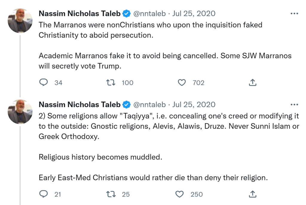 The Marranos were nonChristians who upon the inquisition faked Christianity to aboid persecution. Academic Marranos fake it to avoid being cancelled. Some SJW Marranos will secretly vote Trump. 2) Some religions allow “Taqiyya”, i.e. concealing one’s creed or modifying it to the outside: Gnostic religions, Alevis, Alawis, Druze. Never Sunni Islam or Greek Orthodoxy. Religious history becomes muddled. Early East-Med Christians would rather die than deny their religion.