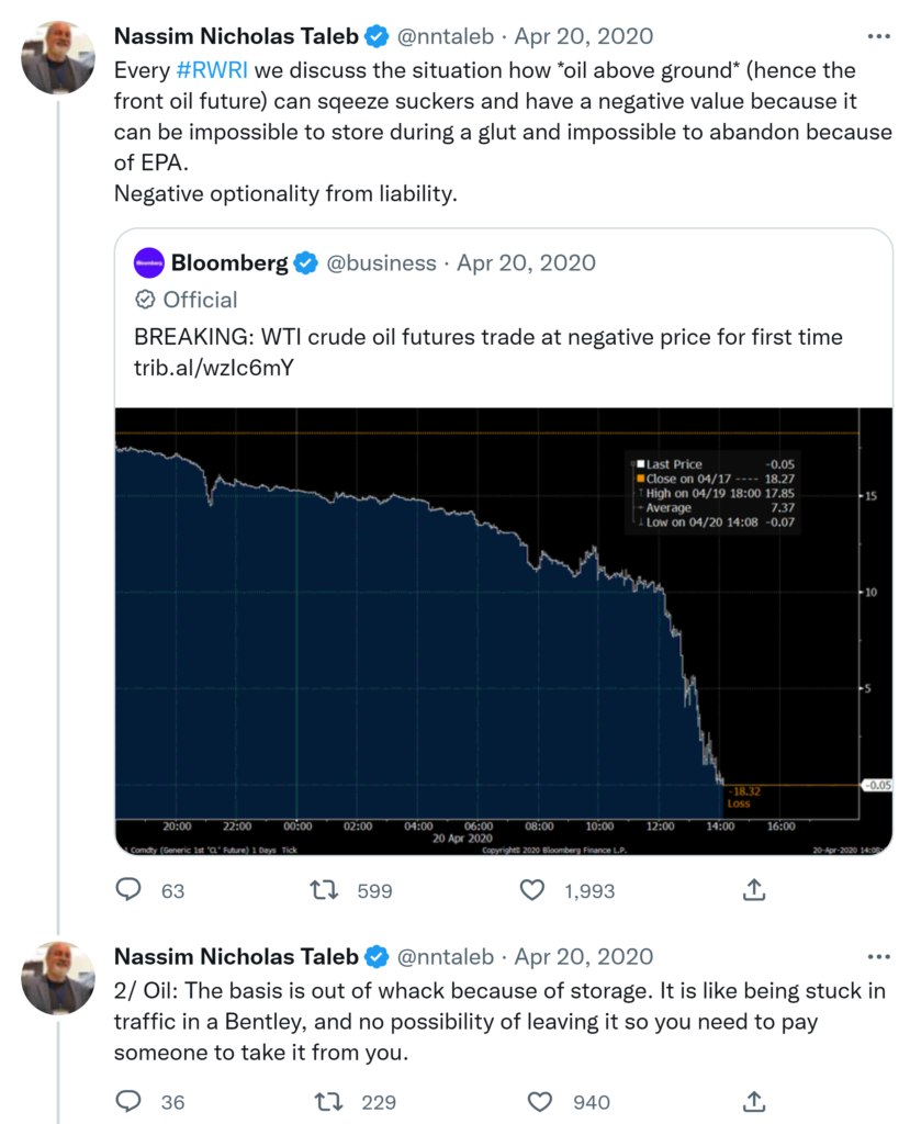 Every #RWRI we discuss the situation how *oil above ground* (hence the front oil future) can sqeeze suckers and have a negative value because it can be impossible to store during a glut and impossible to abandon because of EPA. Negative optionality from liability. 2/ Oil: The basis is out of whack because of storage. It is like being stuck in traffic in a Bentley, and no possibility of leaving it so you need to pay someone to take it from you.
