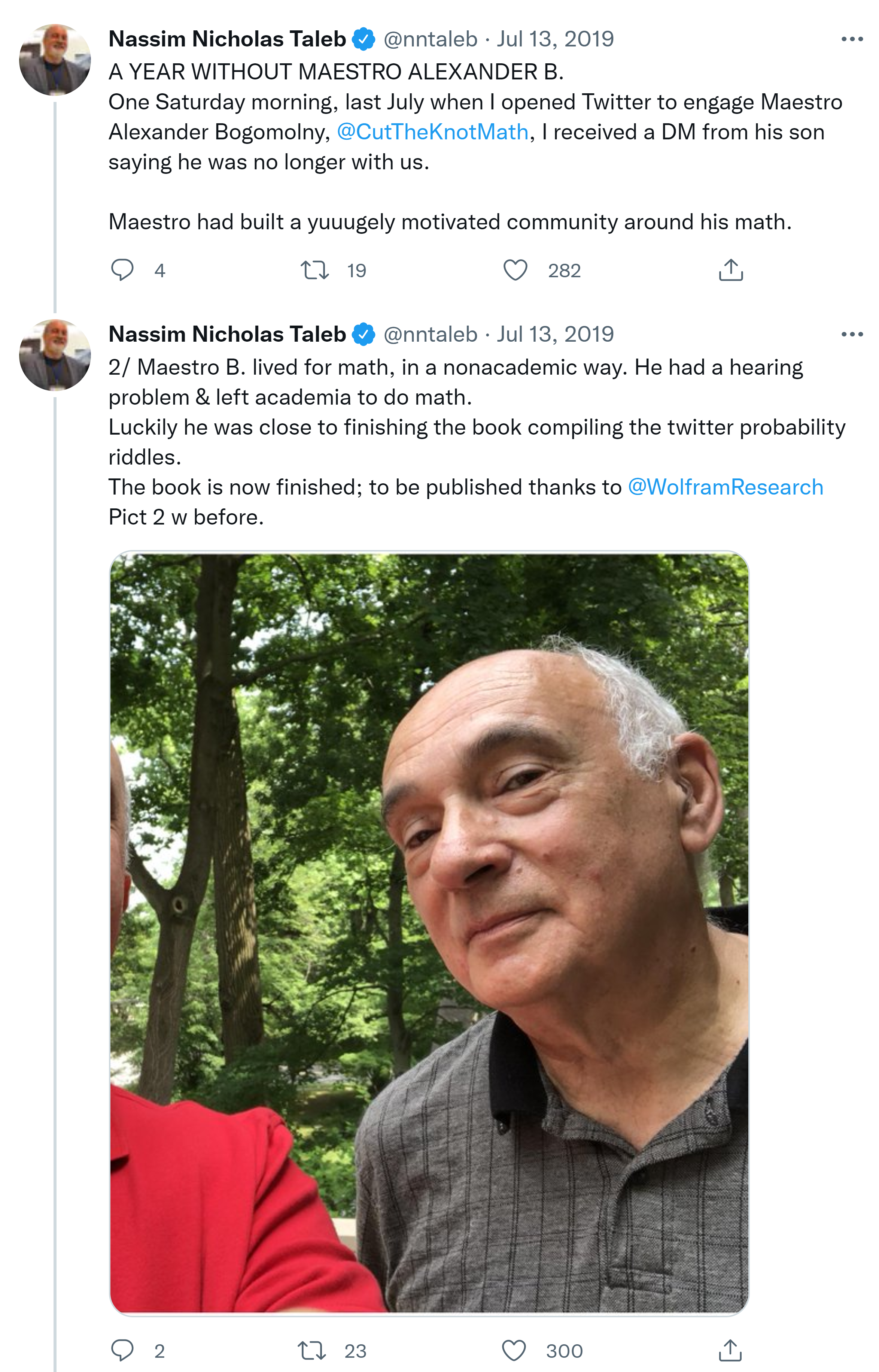A YEAR WITHOUT MAESTRO ALEXANDER B. One Saturday morning, last July when I opened Twitter to engage Maestro Alexander Bogomolny, @CutTheKnotMath , I received a DM from his son saying he was no longer with us. Maestro had built a yuuugely motivated community around his math. 2/ Maestro B. lived for math, in a nonacademic way. He had a hearing problem & left academia to do math. Luckily he was close to finishing the book compiling the twitter probability riddles. The book is now finished; to be published thanks to @WolframResearch Pict 2 w before.