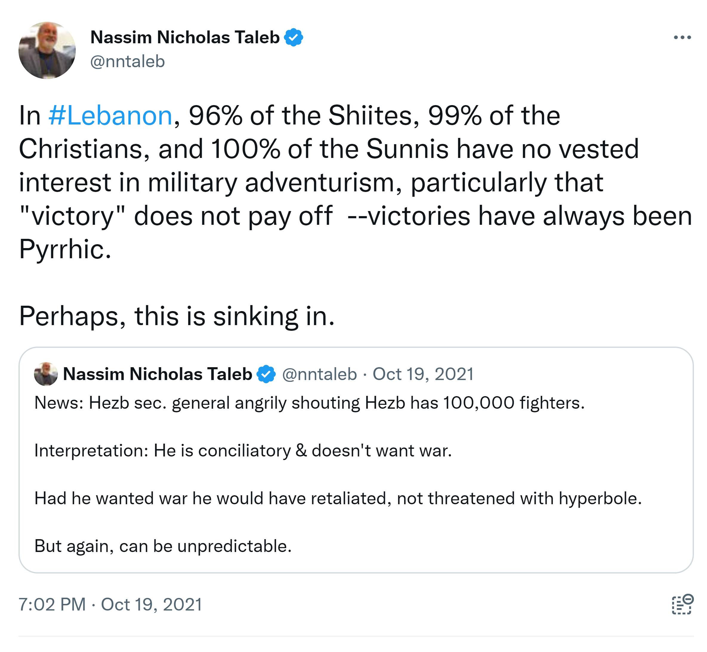 In #Lebanon, 96% of the Shiites, 99% of the Christians, and 100% of the Sunnis have no vested interest in military adventurism, particularly that “victory” does not pay off –victories have always been Pyrrhic. Perhaps, this is News: Hezb sec. general angrily shouting Hezb has 100,000 fighters. Interpretation: He is conciliatory & doesn’t want war. Had he wanted war he would have retaliated, not threatened with hyperbole. But again, can be unpredictable.sinking in.