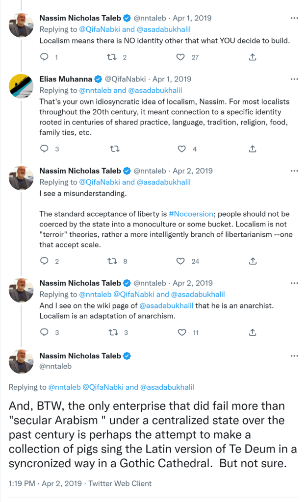 Localism means there is NO identity other that what YOU decide to build. I see a misunderstanding. The standard acceptance of liberty is #Nocoersion; people should not be coerced by the state into a monoculture or some bucket. Localism is not “terroir” theories, rather a more intelligently branch of libertarianism –one that accept scale.And I see on the wiki page of @asadabukhalil that he is an anarchist. Localism is an adaptation of anarchism. And, BTW, the only enterprise that did fail more than “secular Arabism ” under a centralized state over the past century is perhaps the attempt to make a collection of pigs sing the Latin version of Te Deum in a syncronized way in a Gothic Cathedral. But not sure.